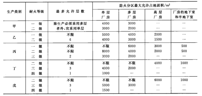 生產(chǎn)安全防火不但對各類廠房的耐火等級給出要求,而且對廠房的層數(shù)和占地面積有所限制,并且應(yīng)符合圖1的要求(建筑設(shè)計防火規(guī)范另有規(guī)定者除外)。