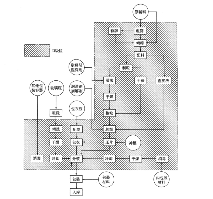 片劑的主要生產工序包括配料、造粒、干燥、整粒與總混、壓片、包衣、分裝、包裝和入庫等,其生產工藝流程及對環境的潔凈等級要求如圖1所示,其中配料、造粒、干燥、整粒與總混、壓片、包衣和分裝等工序應在不低于D級的制藥凈化車間的潔凈環境中進行。