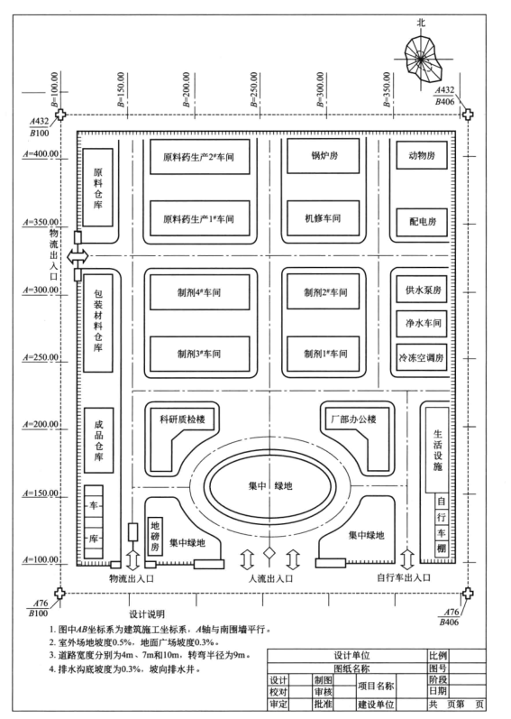 (2)建筑施工坐標(biāo)系 若制藥廠廠區(qū)和建筑物的方位不是正南正北方向,即與地理測(cè)量坐標(biāo)網(wǎng)不是平行的,而存在一定的方位角此時(shí),用地理測(cè)量坐標(biāo)網(wǎng)對(duì)廠區(qū)或建筑物進(jìn)行定位,就必須經(jīng)過繁瑣的換算,很不方便為減少廠區(qū)和建筑物定位時(shí)的麻煩,總平面設(shè)計(jì)常采用與廠區(qū)和建筑物方位一致的建筑施工坐標(biāo)系。建筑施工坐標(biāo)系的坐標(biāo)軸分別用A和B表示,故又稱為AB坐標(biāo)系。在AB坐標(biāo)系中作間距為50m或100m的方格網(wǎng),并標(biāo)定出廠址和各建筑物的地理位置。由于AB坐標(biāo)系以廠區(qū)或建筑物的方位為坐標(biāo)軸,故在確定廠區(qū)和建筑物的位置時(shí)可避免繁瑣的換算,并給現(xiàn)場(chǎng)施工放線帶來了方便。