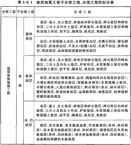 3.0.1 建筑地面工程子分部工程、分項工程的劃分應按表3.0.1的規定執行。