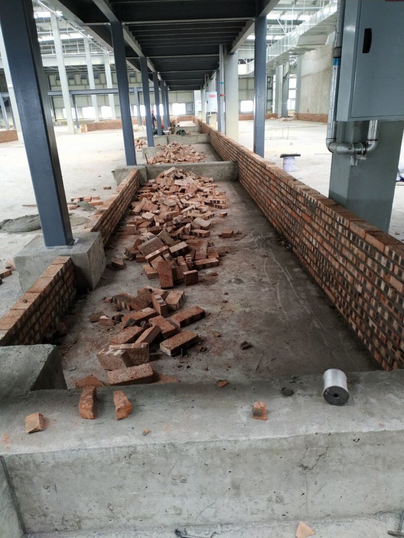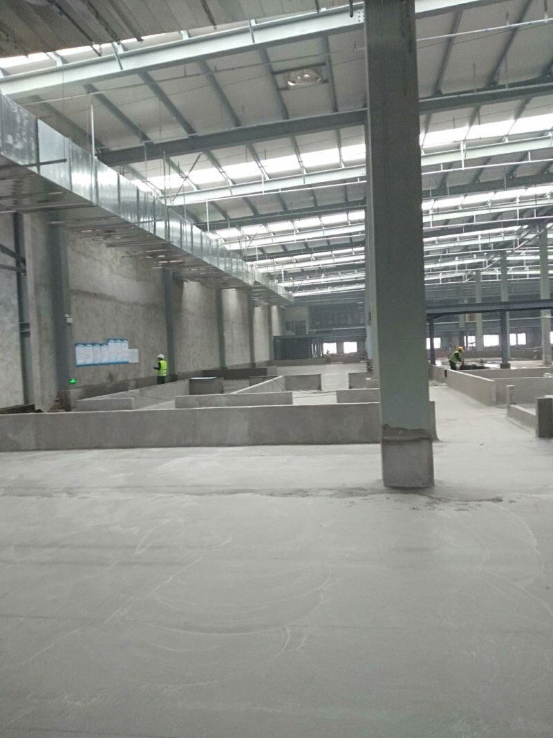 車間施工現場,鋼筋預制捆扎完成,擋水墻抹灰施工,排水溝貼磚完。