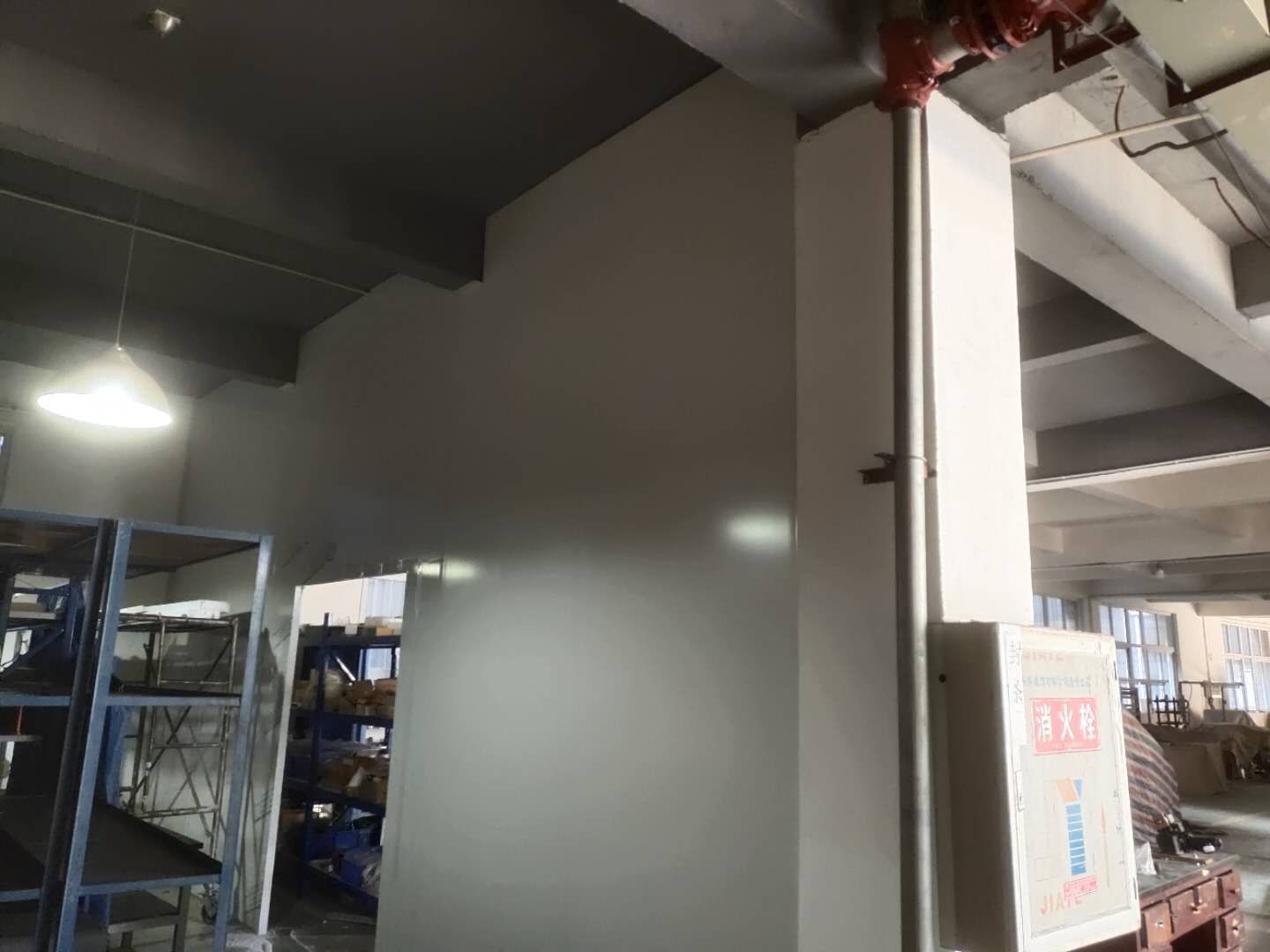 1.門安裝完成,擋鼠板安裝完成,彩鋼收尾結束。2.照明燈換氣扇安裝完成95%,紫外線燈安裝完成,插座安裝完成。