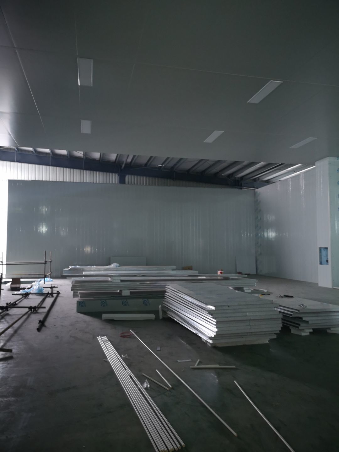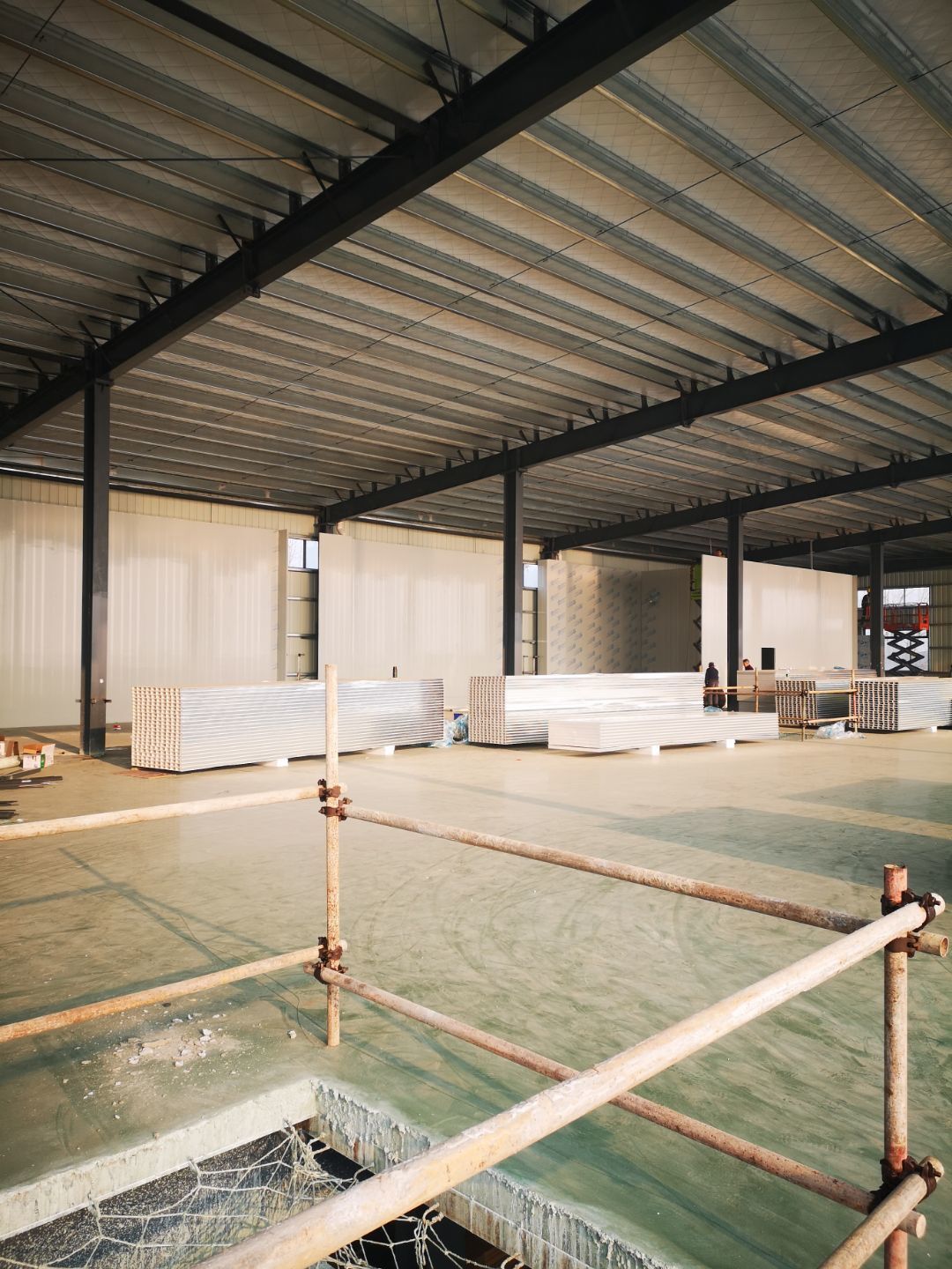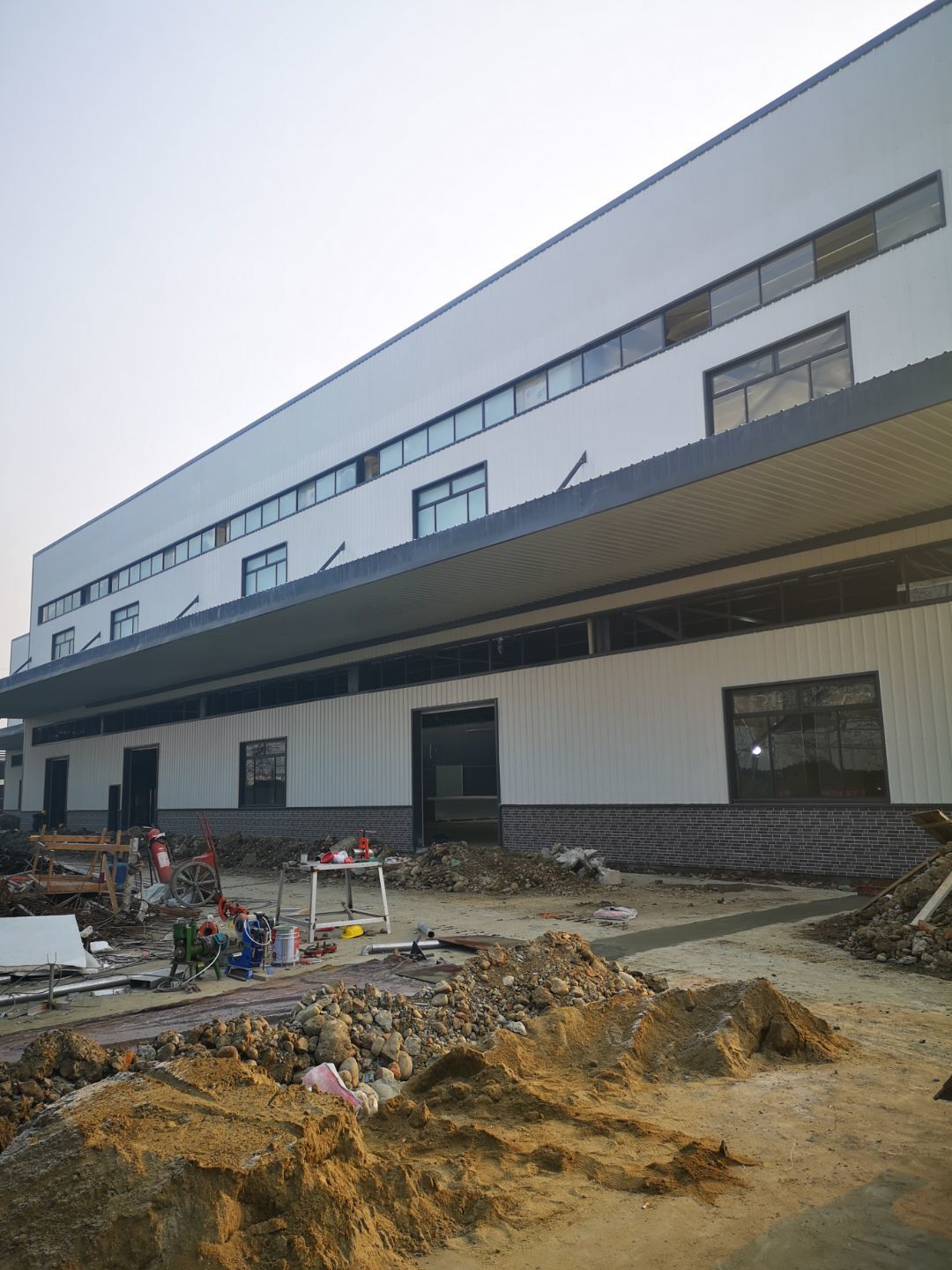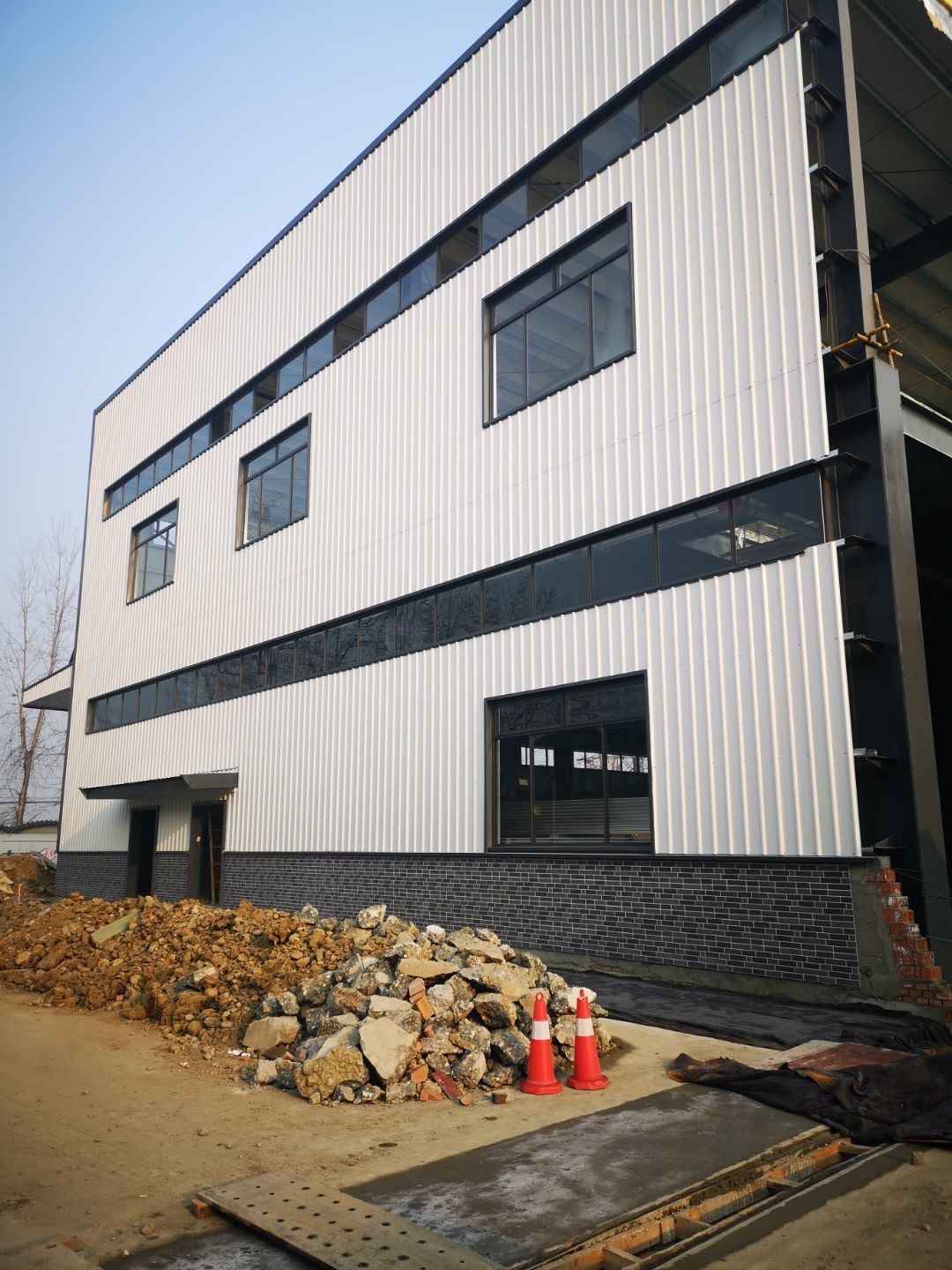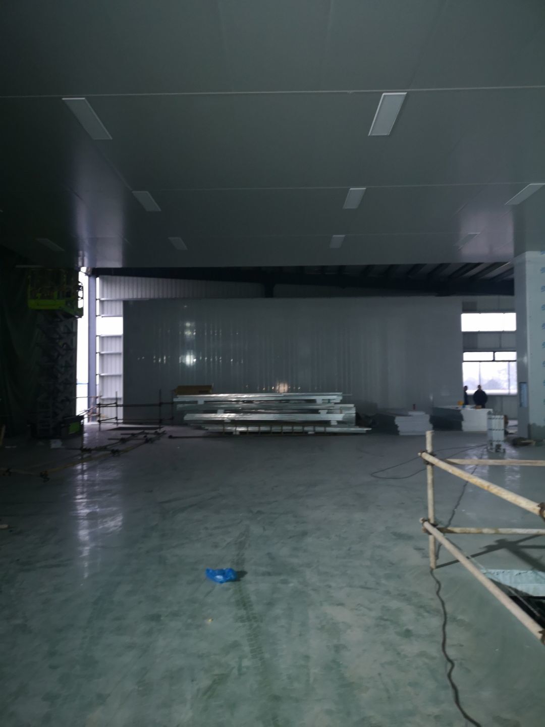 廠房外觀裝玻璃,內(nèi)裝彩鋼板到現(xiàn)場,隔斷開始施工