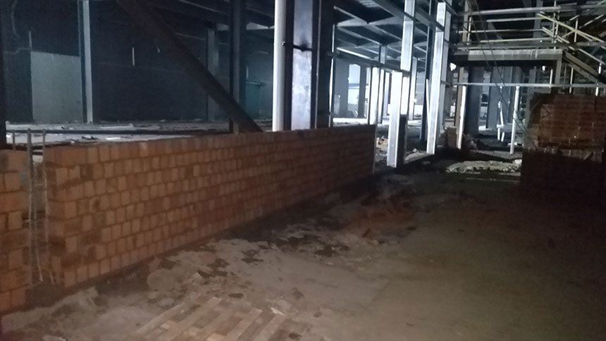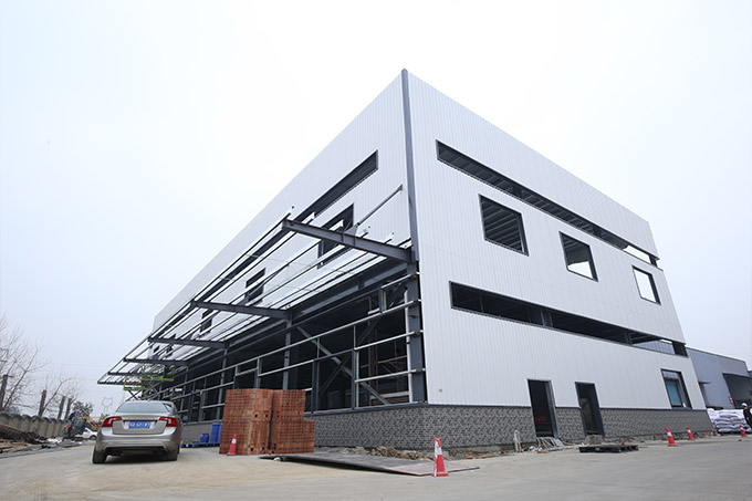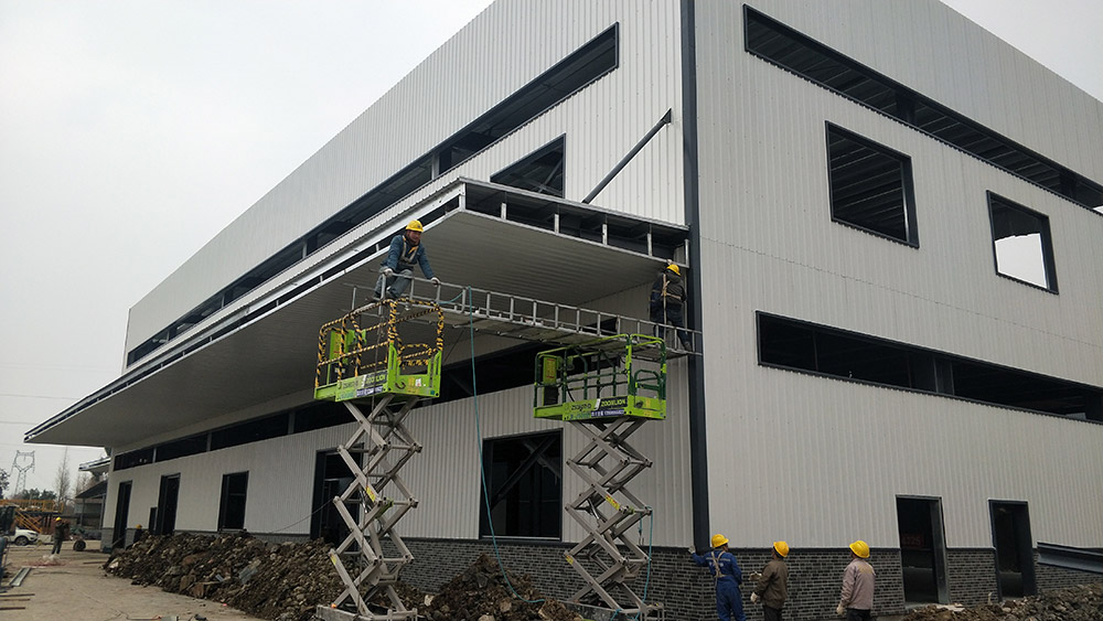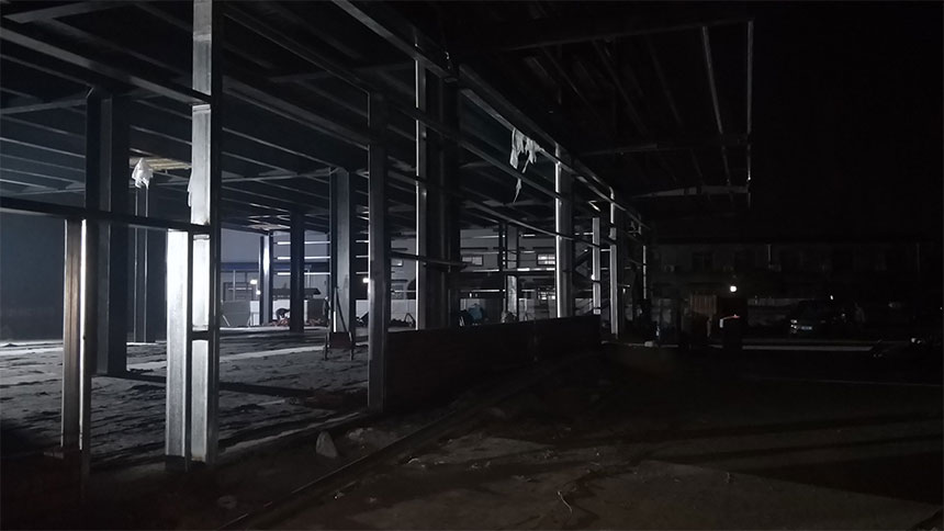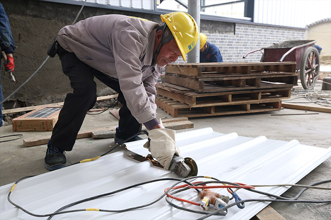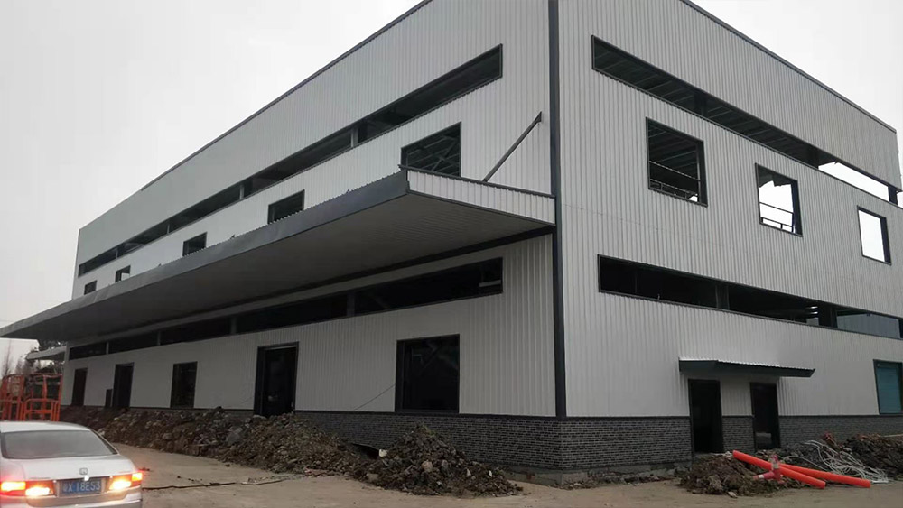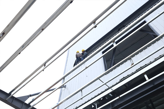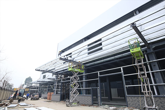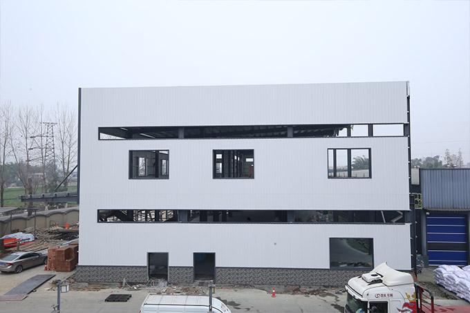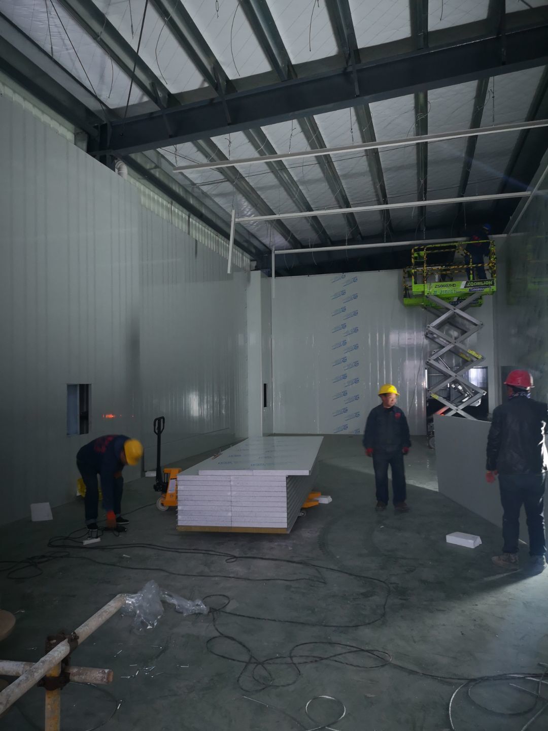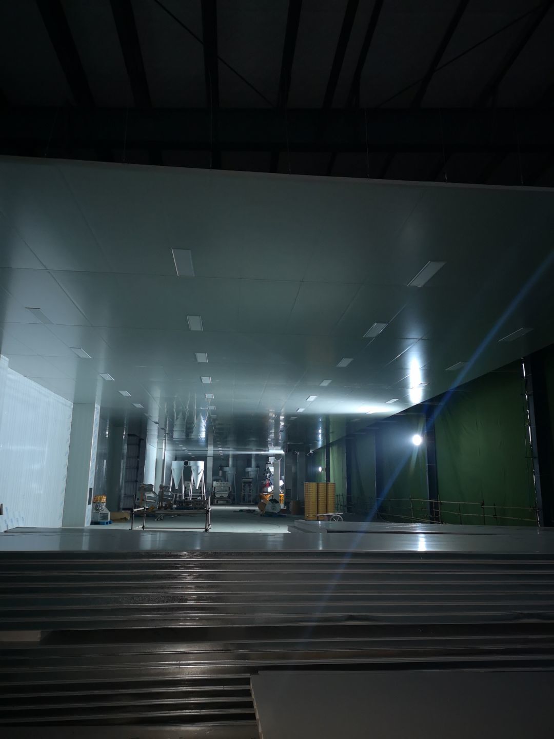 廠房外觀裝玻璃,內(nèi)裝彩鋼板到現(xiàn)場,隔斷開始施工