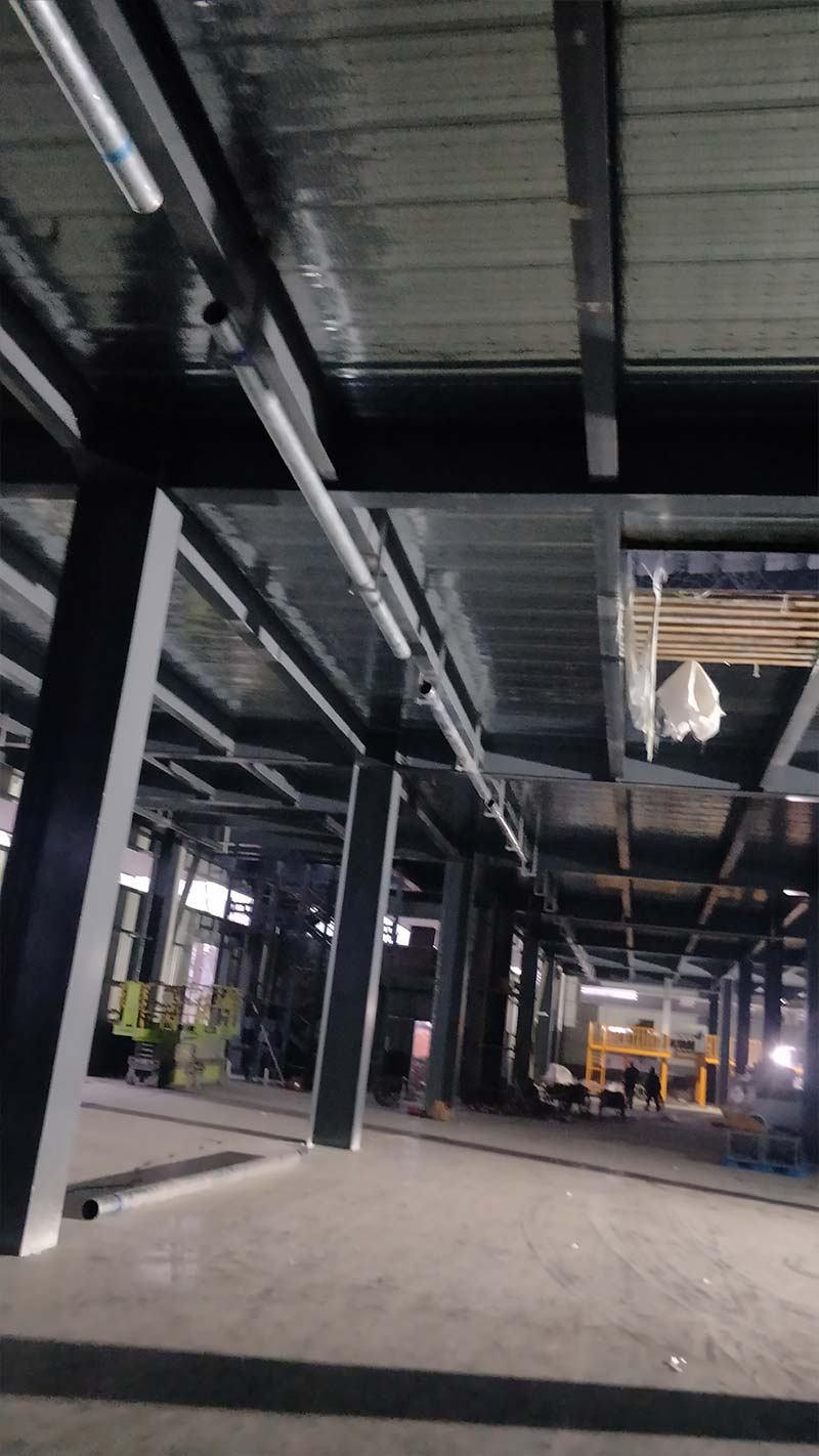 1.二層樓板混凝土完成100%;2.樓板鋼筋綁扎完成100%;3.墻檁條安裝完成20%;4.二樓水電預(yù)埋完成100%;5.二樓金剛砂完成30%