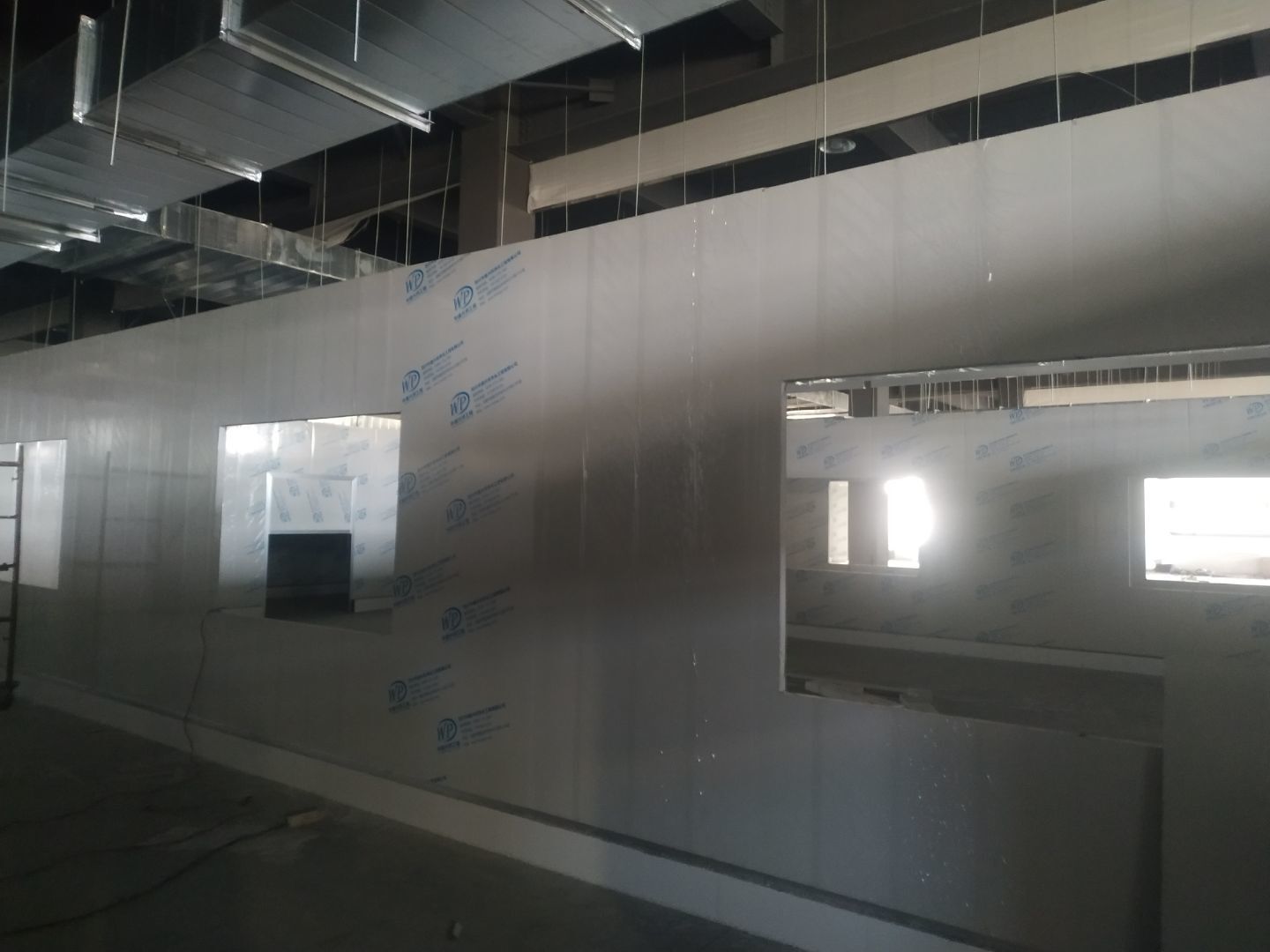 防火隔斷墻上門洞開孔完成,彩鋼墻窗戶開孔完成,門料預制,撕膜打膠,彩鋼板材料到場。