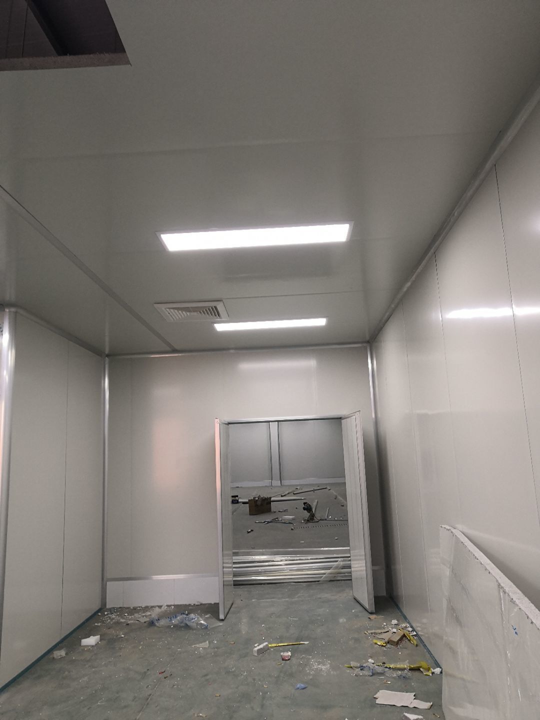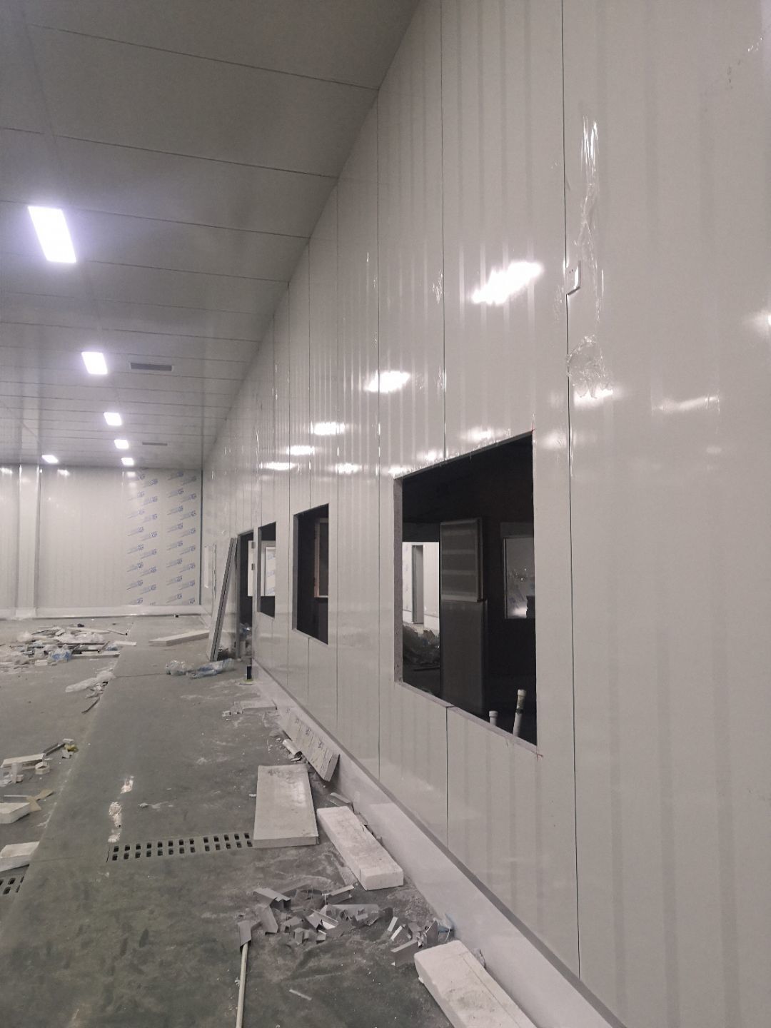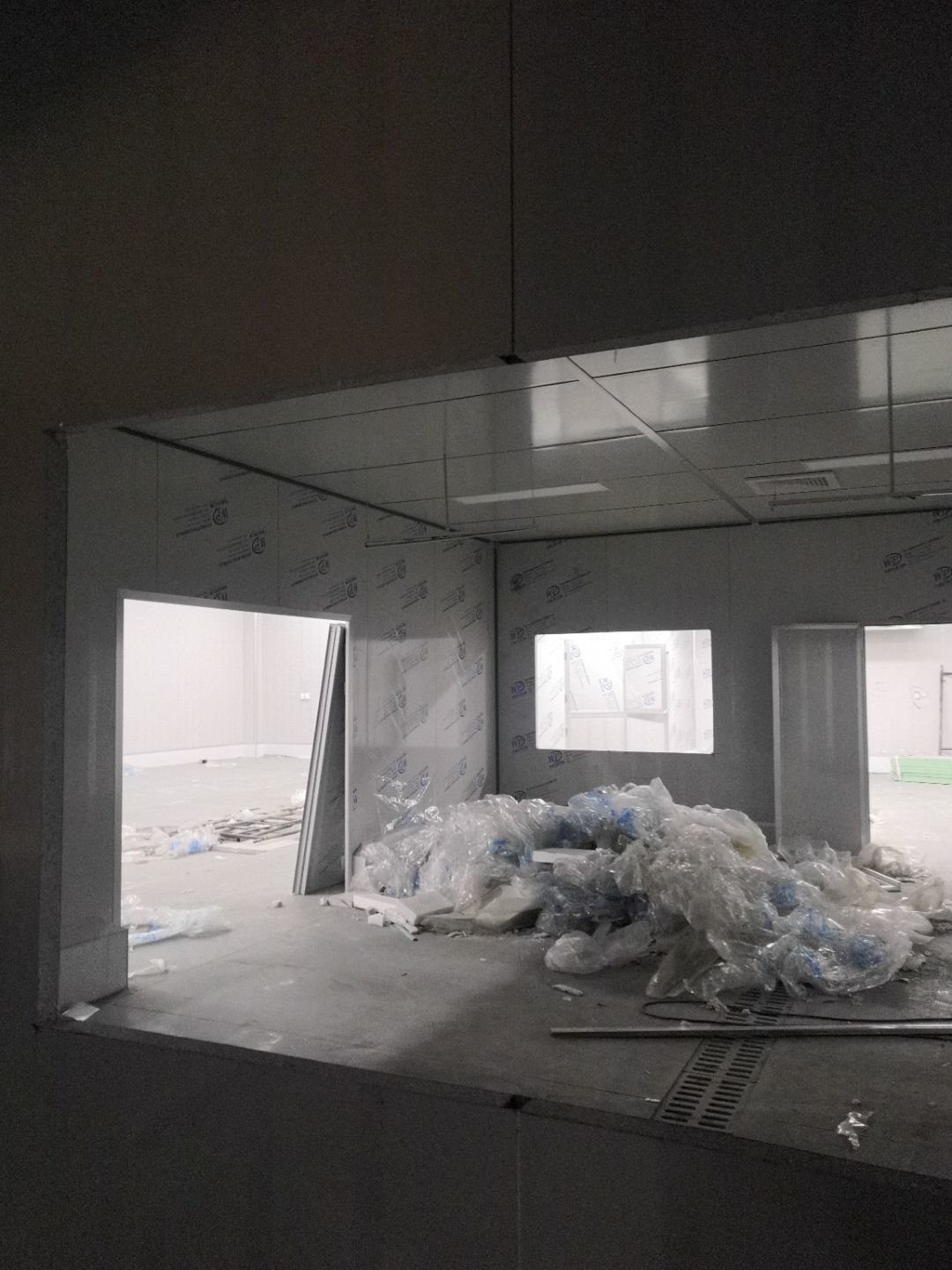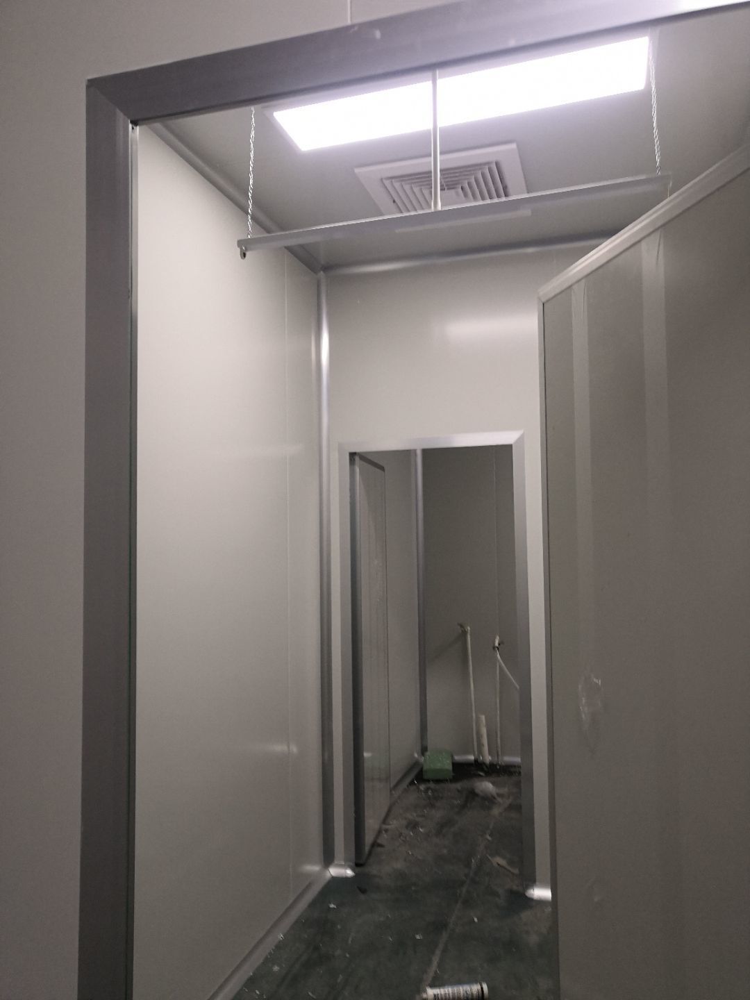 1.打膠,拍圓弧,做風(fēng)淋室,裝觀察窗 2.吊三防板 3.三防板裝燈,開關(guān),插座
