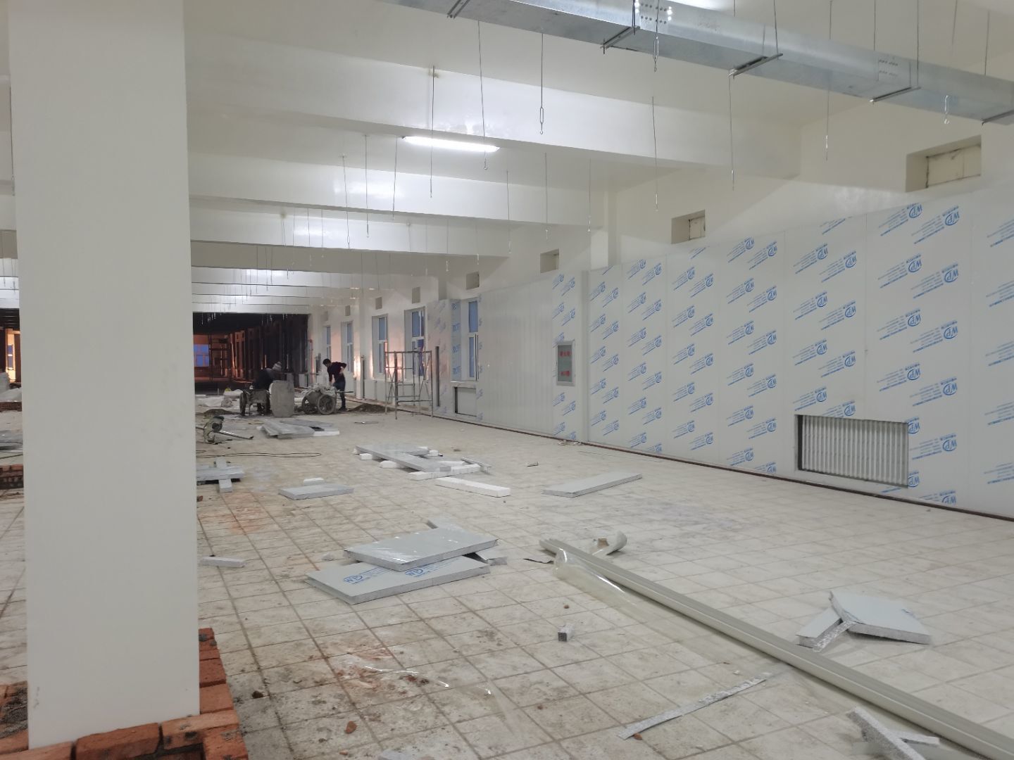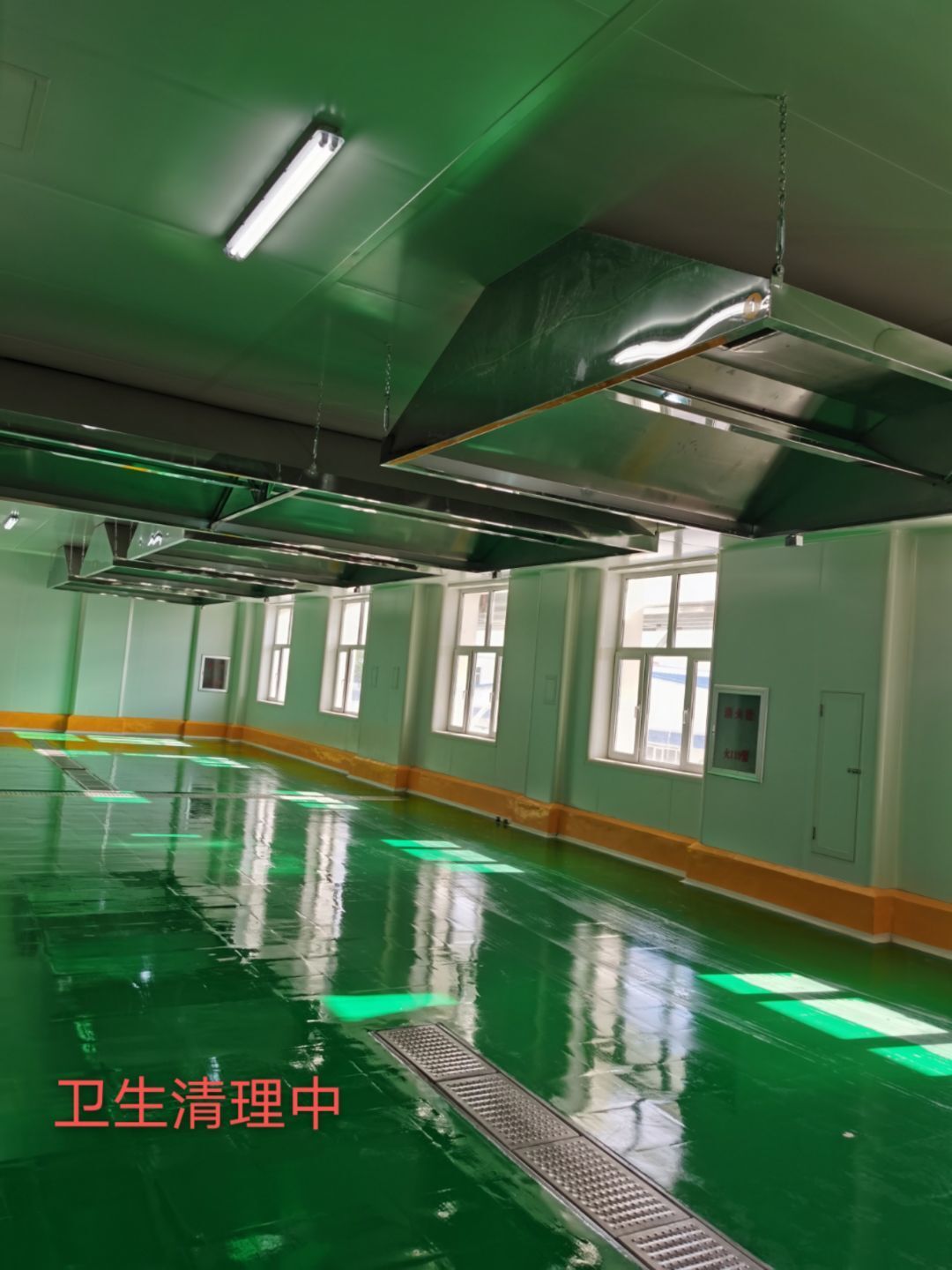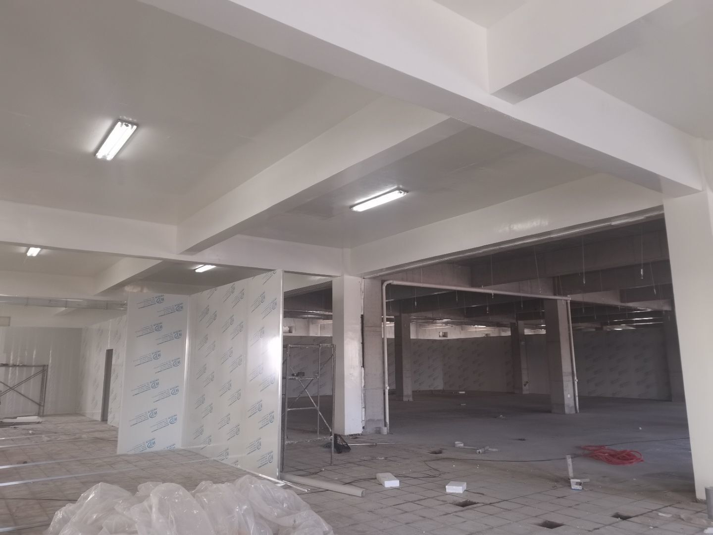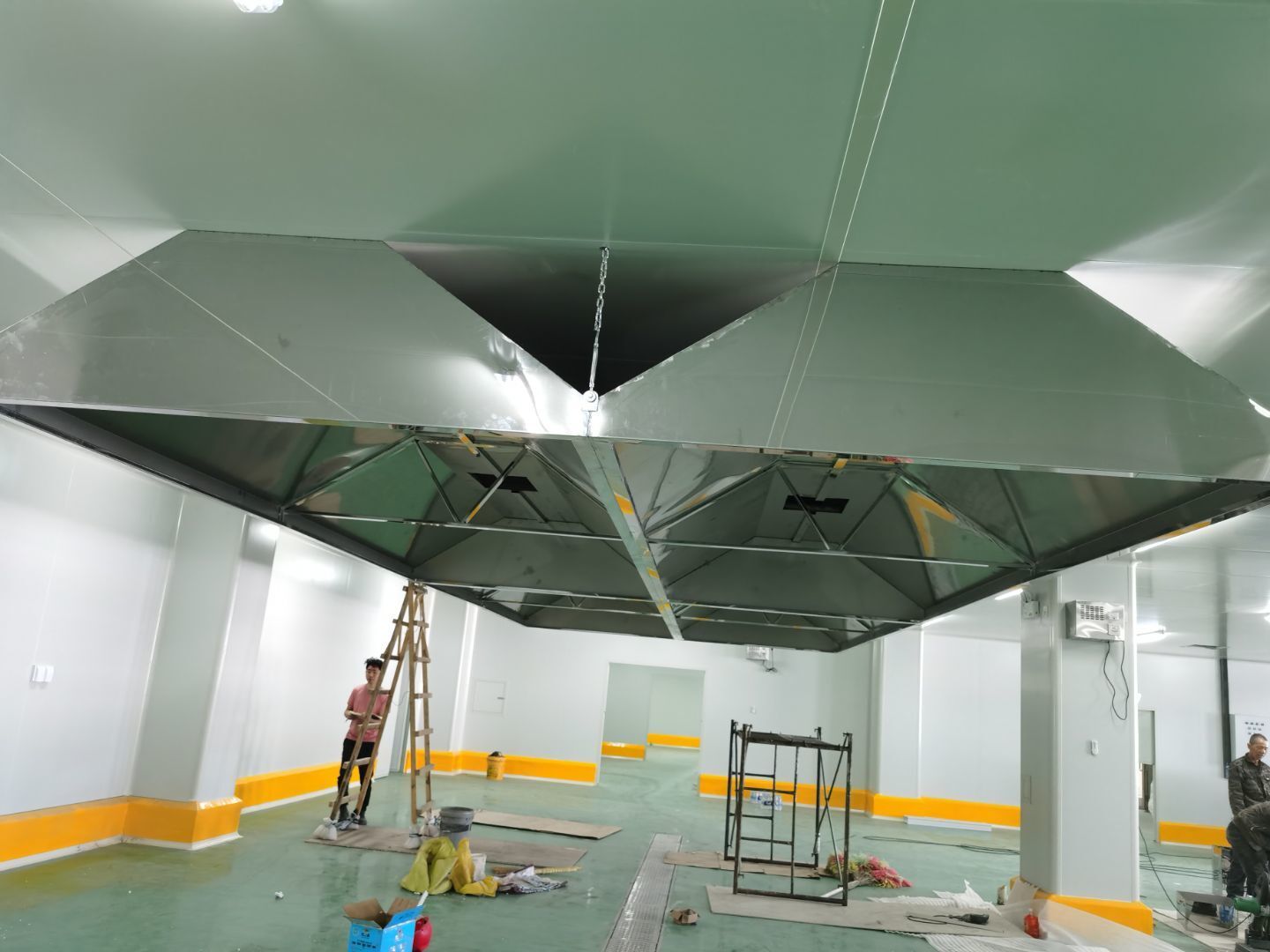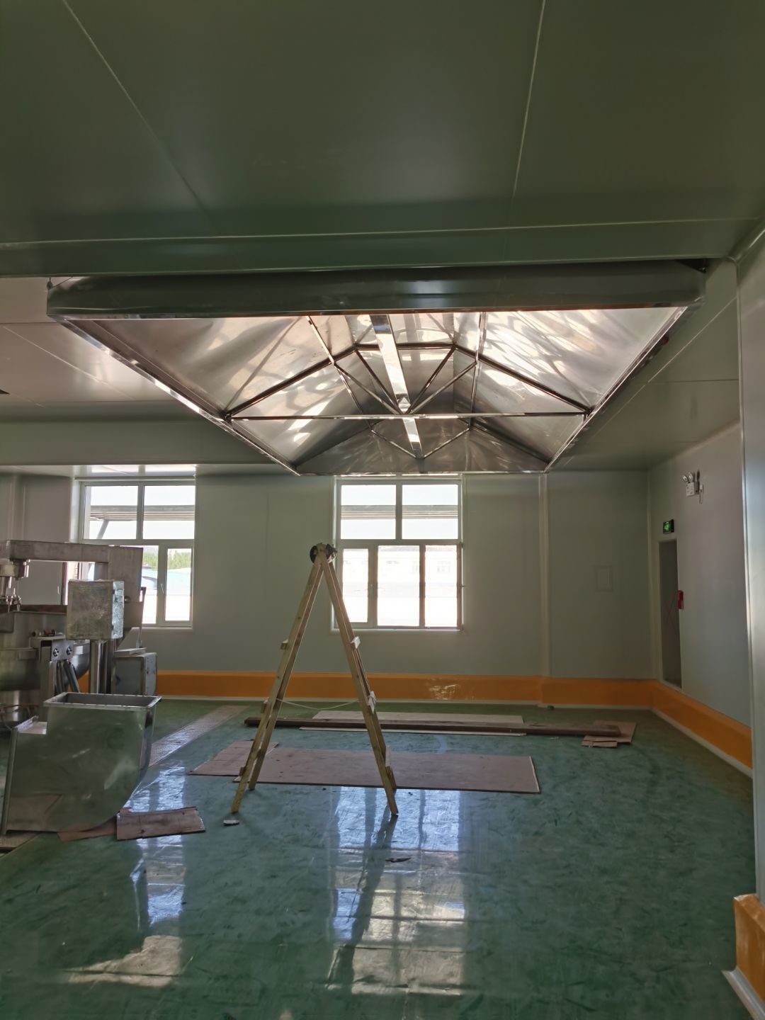 1.彩鋼吊頂完成95%; 2.煙罩風管完成15%; 3.彩鋼板收尾工作完成65%; 4.空調機組已進場; 5.環氧地坪完成100%;6.彩鋼門窗裝制作完成100%。