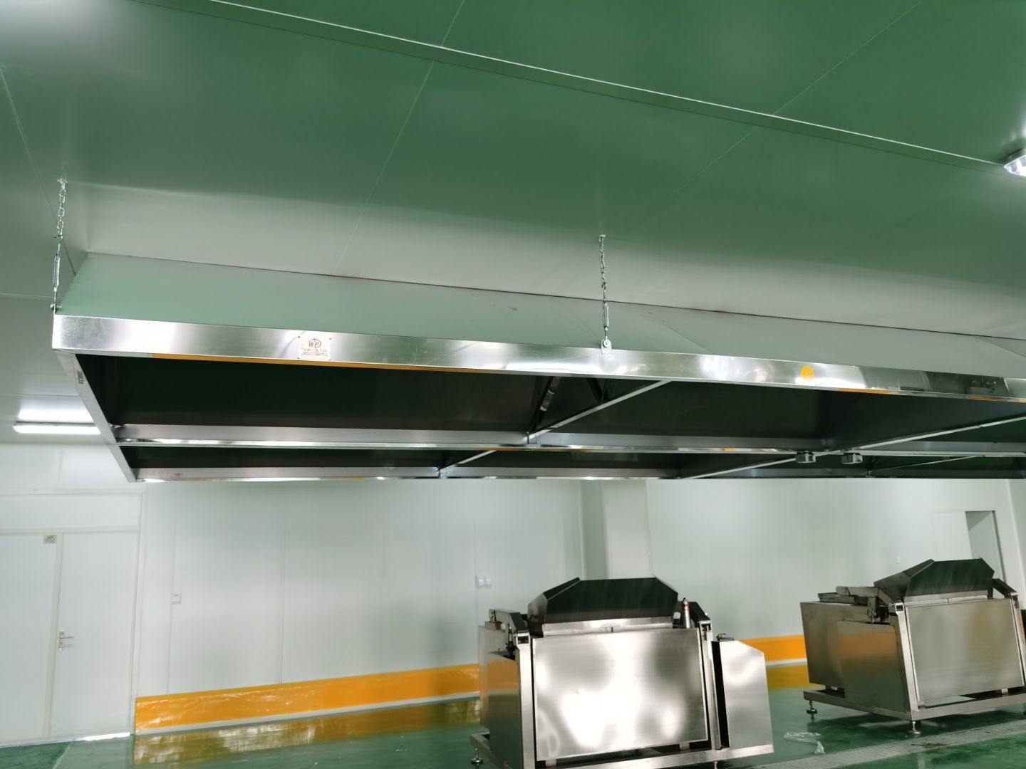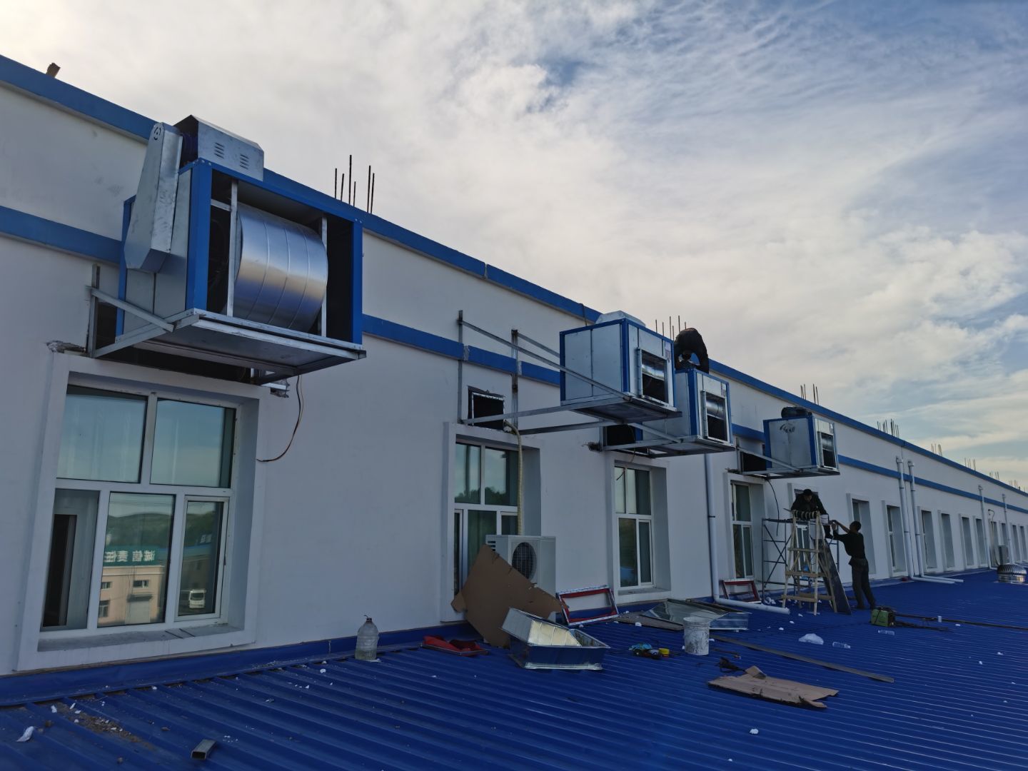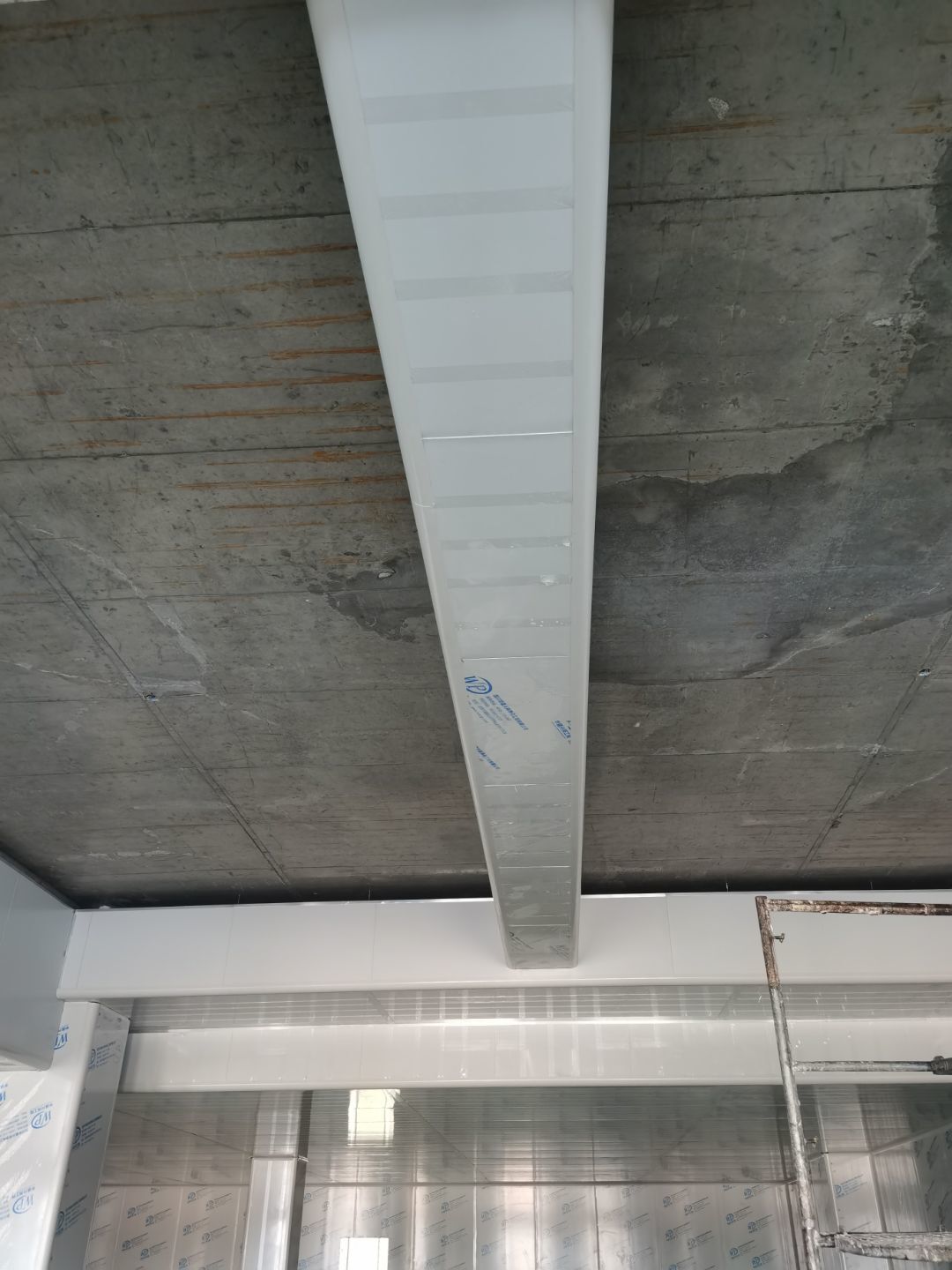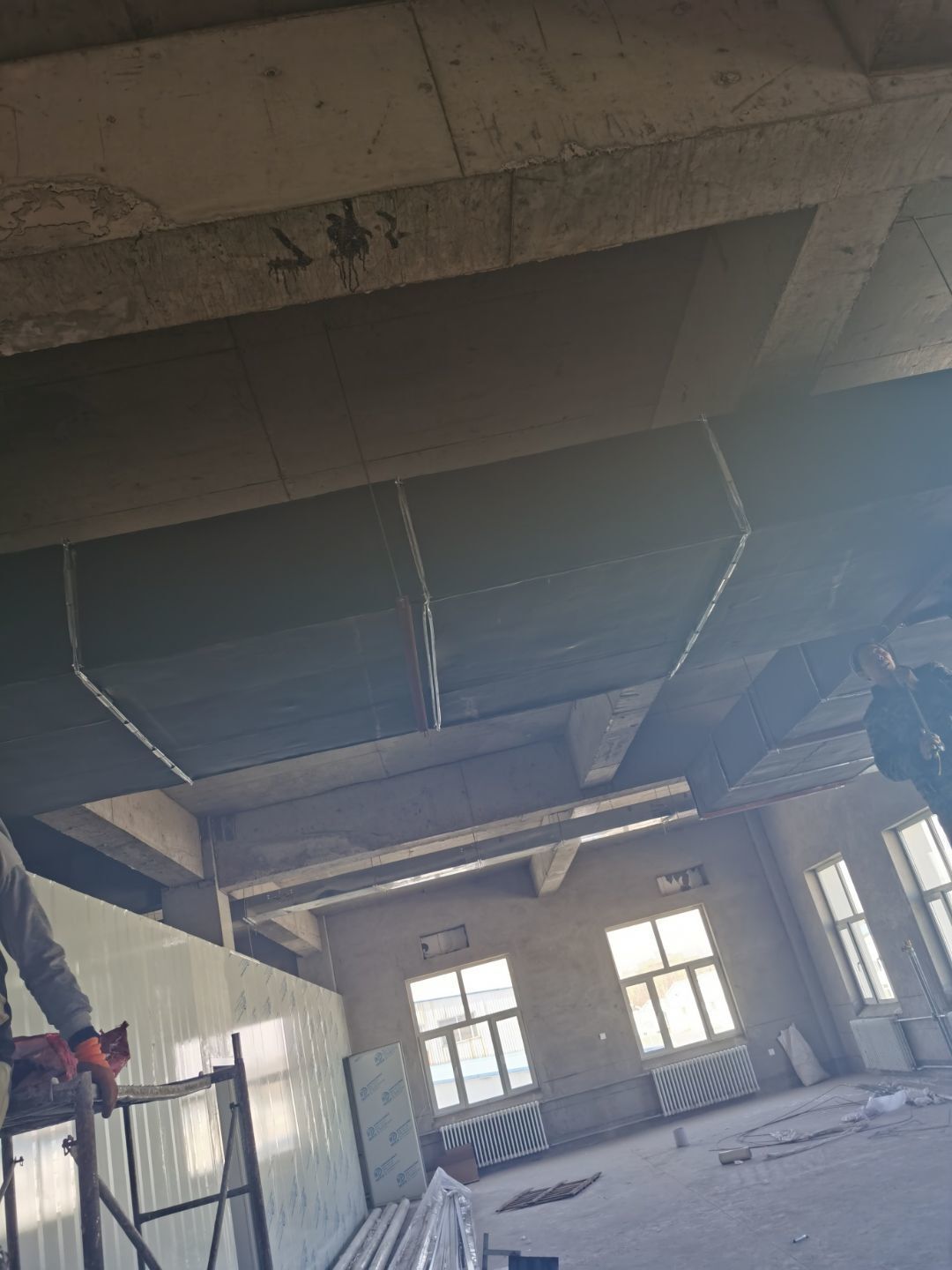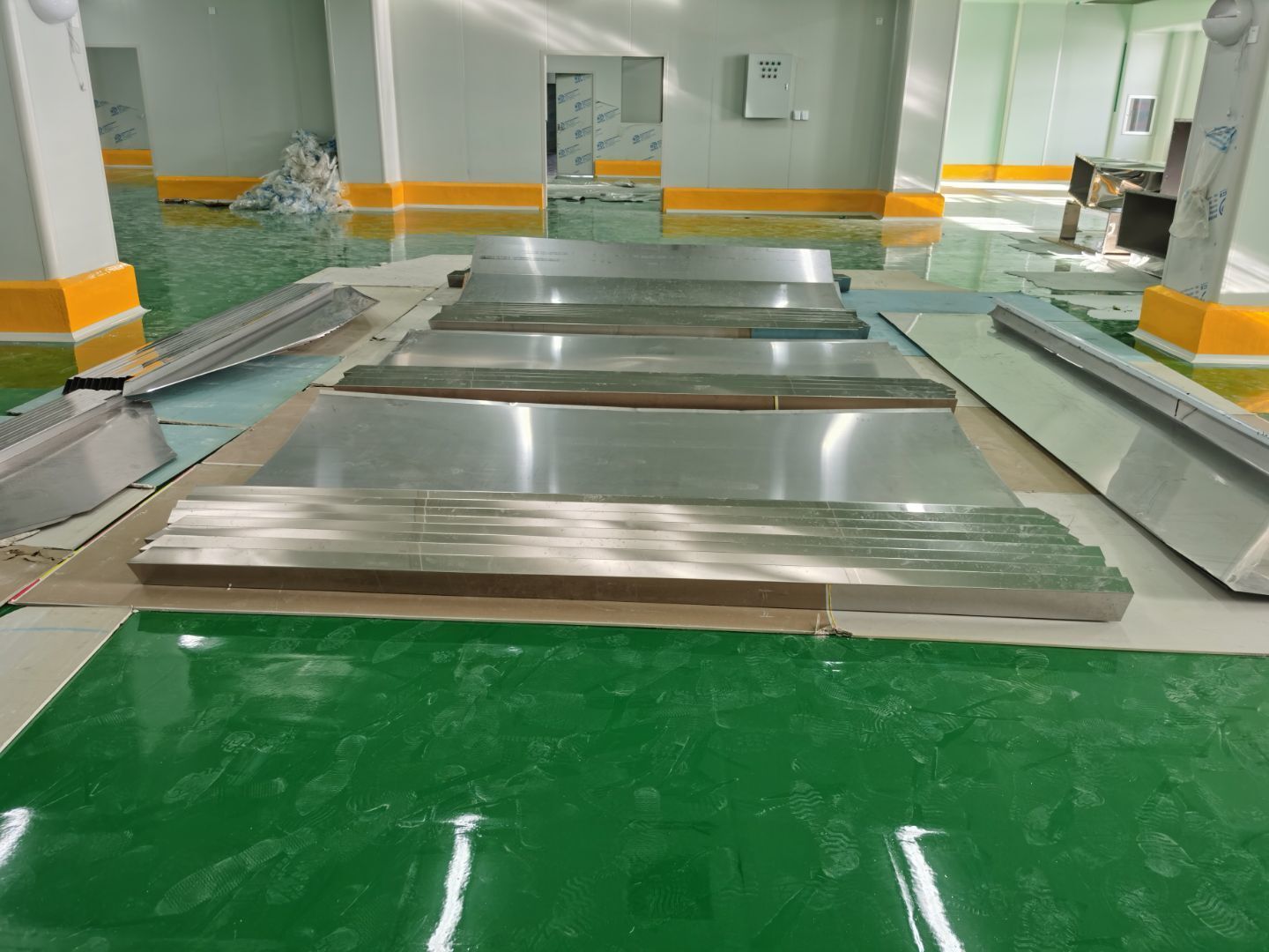1.彩鋼吊頂完成95%; 2.煙罩風管完成15%; 3.彩鋼板收尾工作完成65%; 4.空調機組已進場; 5.環氧地坪完成100%;6.彩鋼門窗裝制作完成100%。