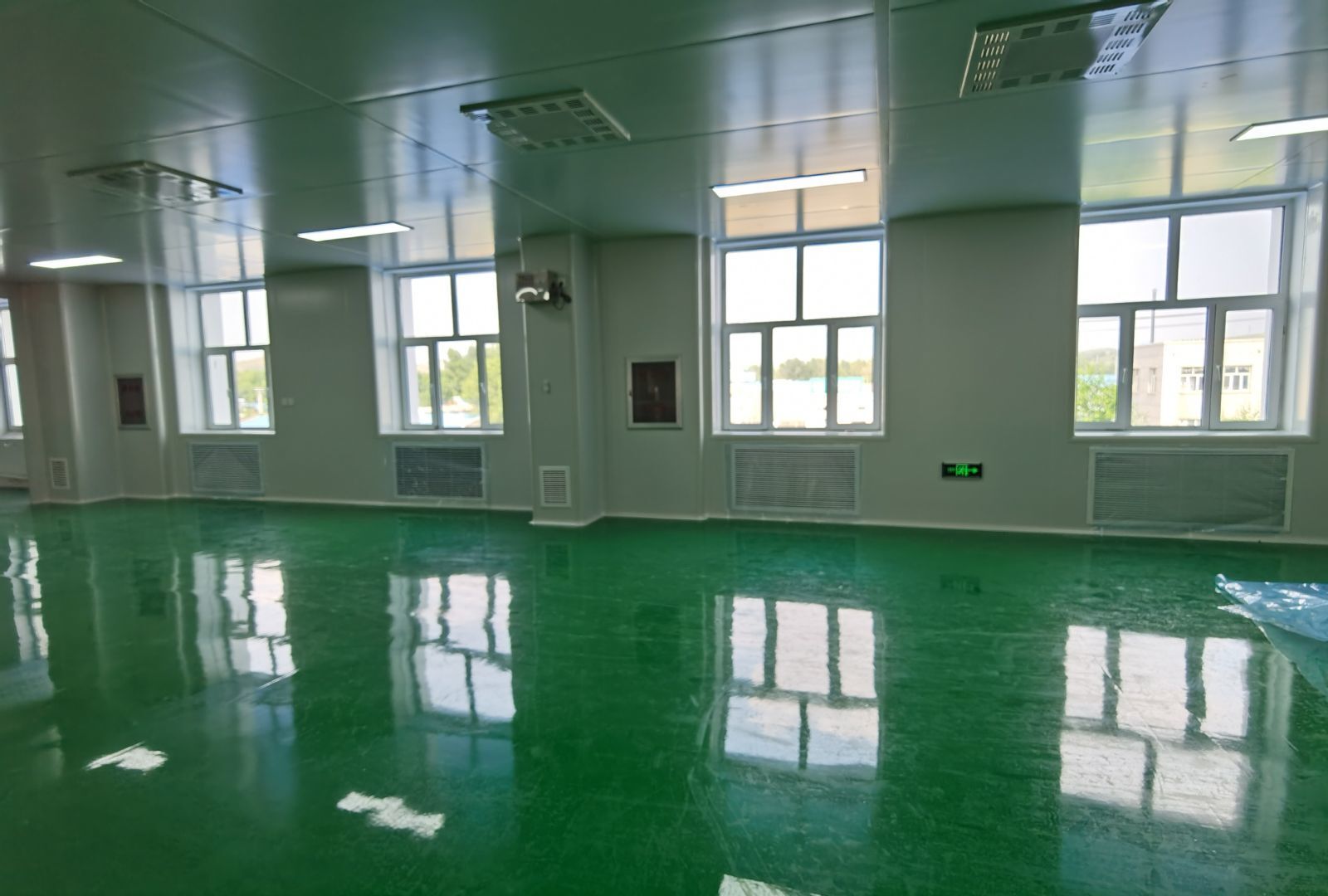 1.10萬級風管主管安裝完成90% ;2.彩鋼板收尾工作完成70% ;3.電安裝完成75% ;4.三防板吊頂安裝完成100%;5.環氧地坪材料進場。