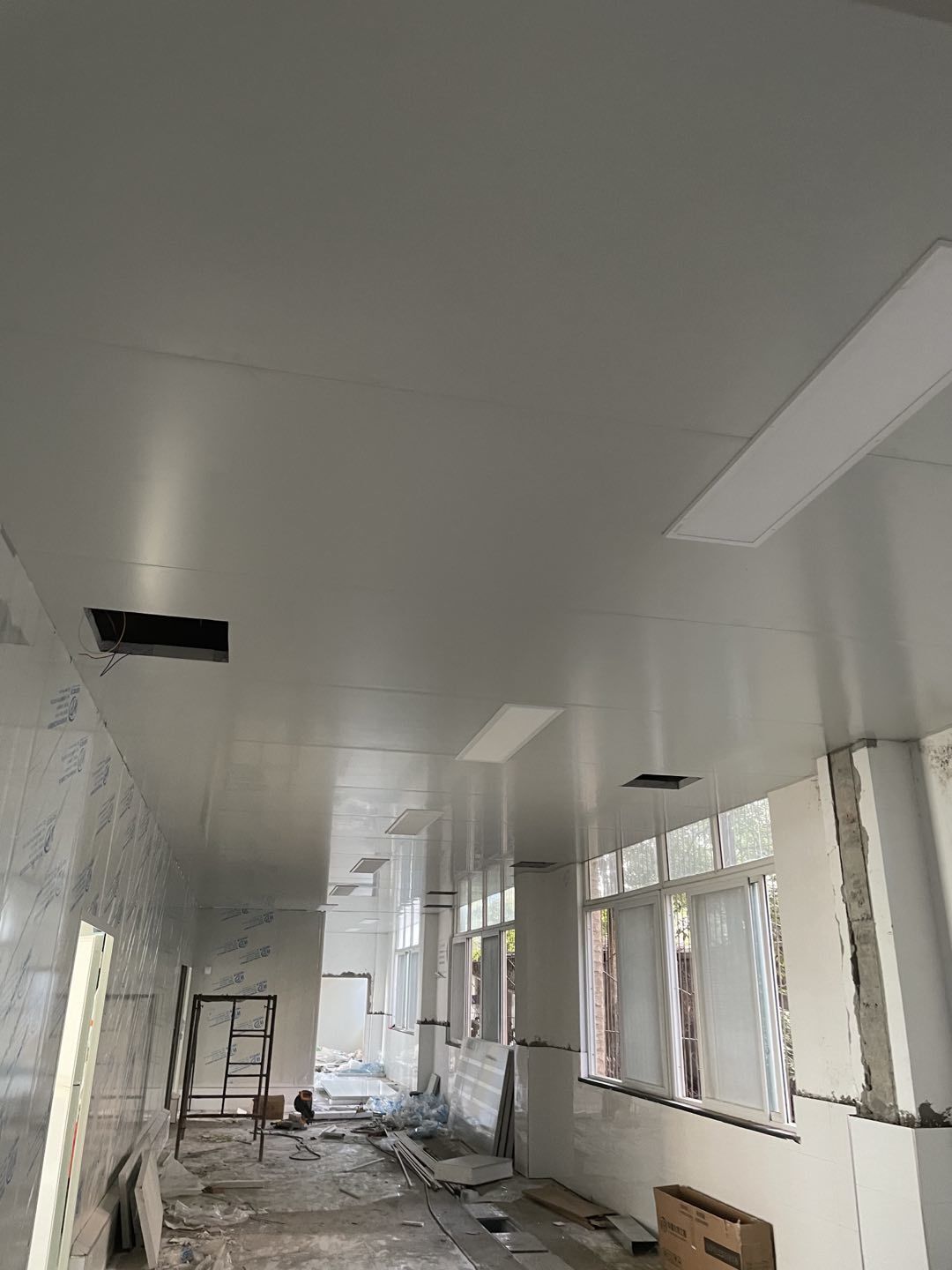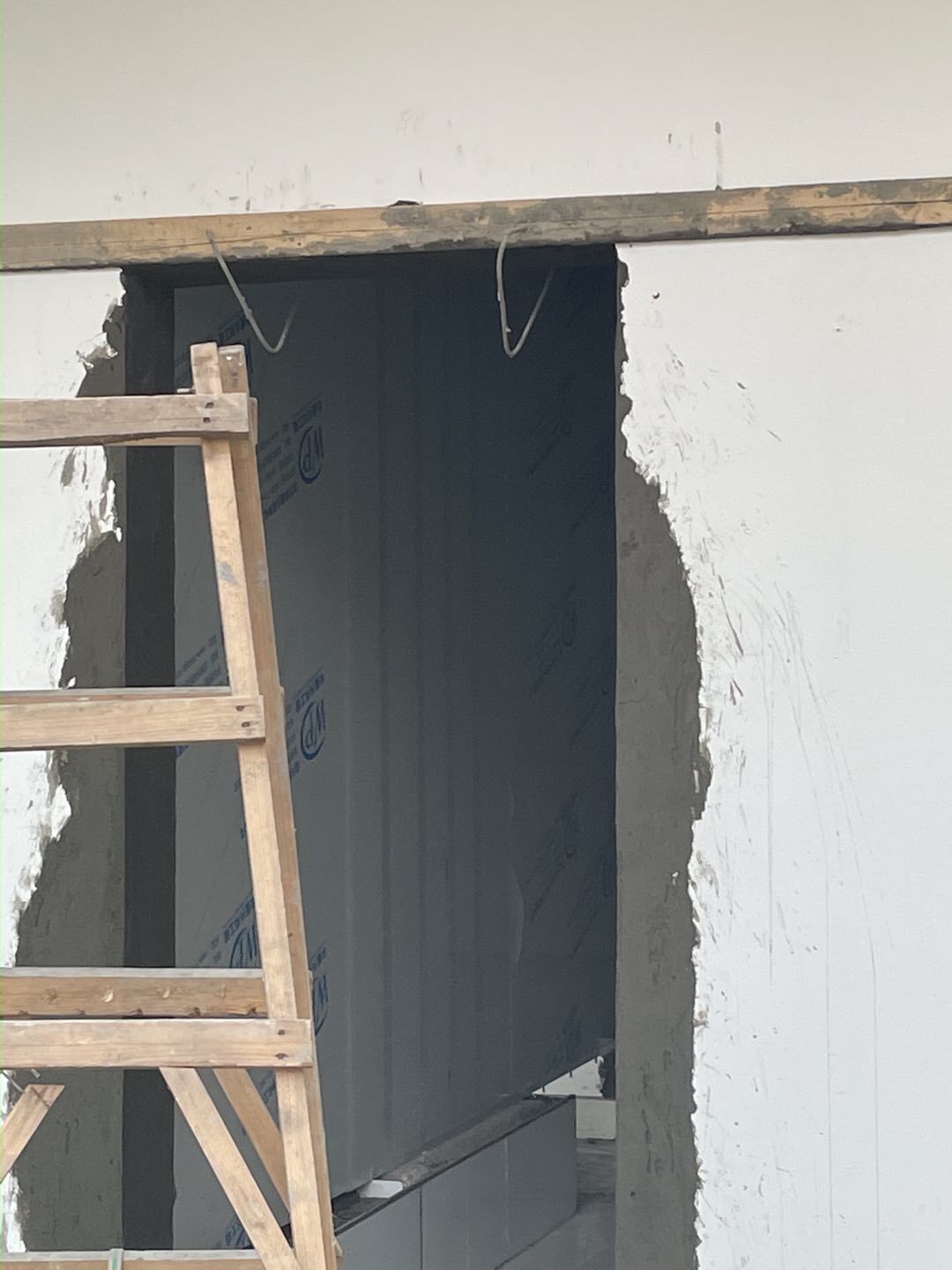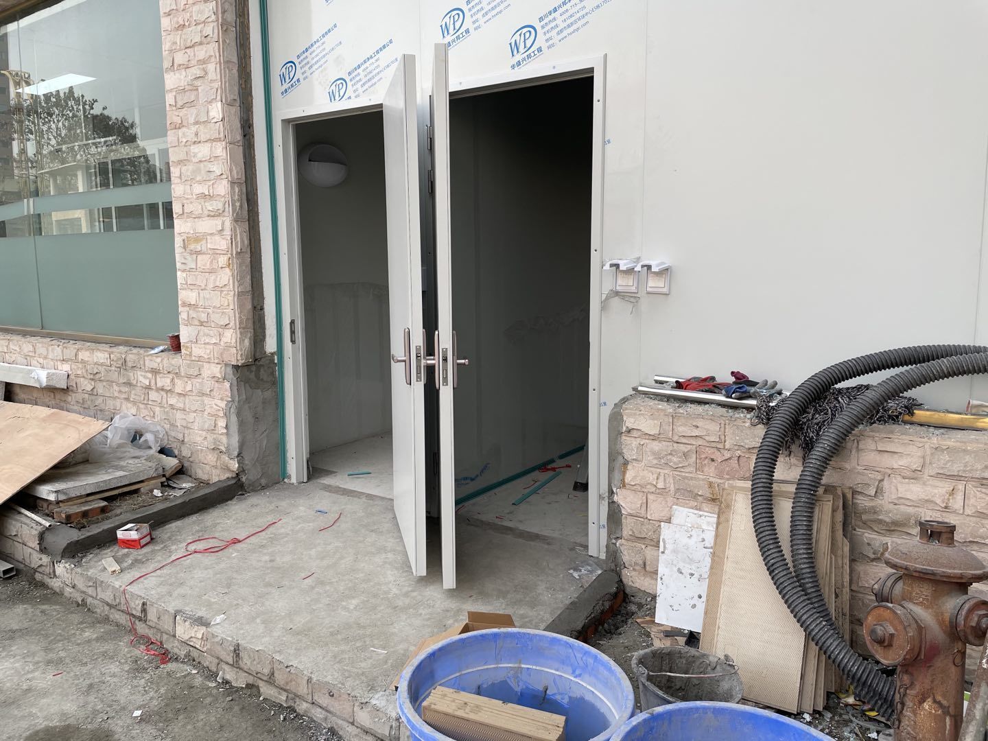 建渣清理完工,燈以及電路完成,鋼制門單門安裝完成。板材進(jìn)場(chǎng),鋼絲繩掛完。