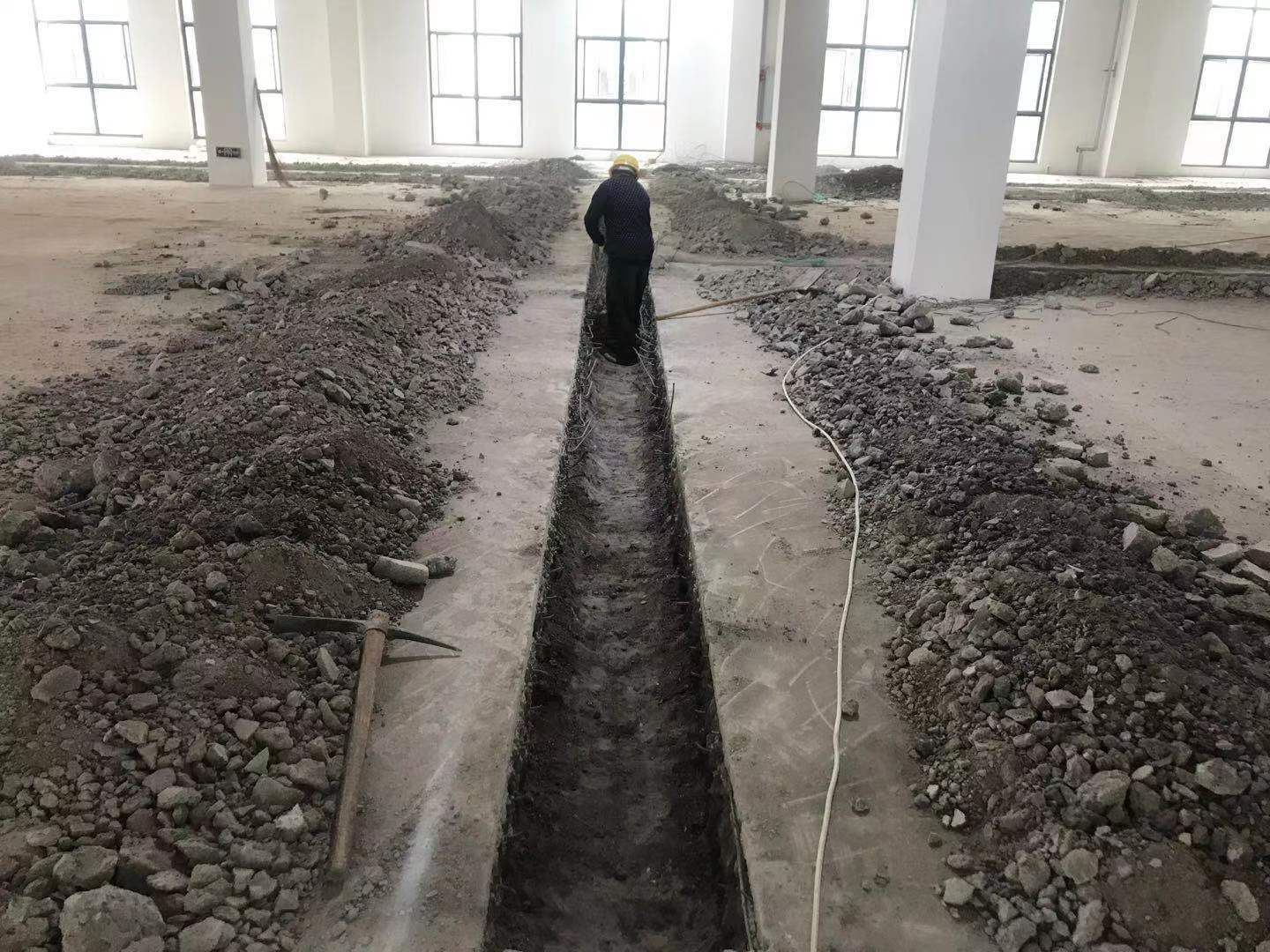 四川洛鮮食品科技有限公司廠房裝修現場:1、水泥河沙等土建材料到場。 2、放線,排水溝排水管切縫完成。