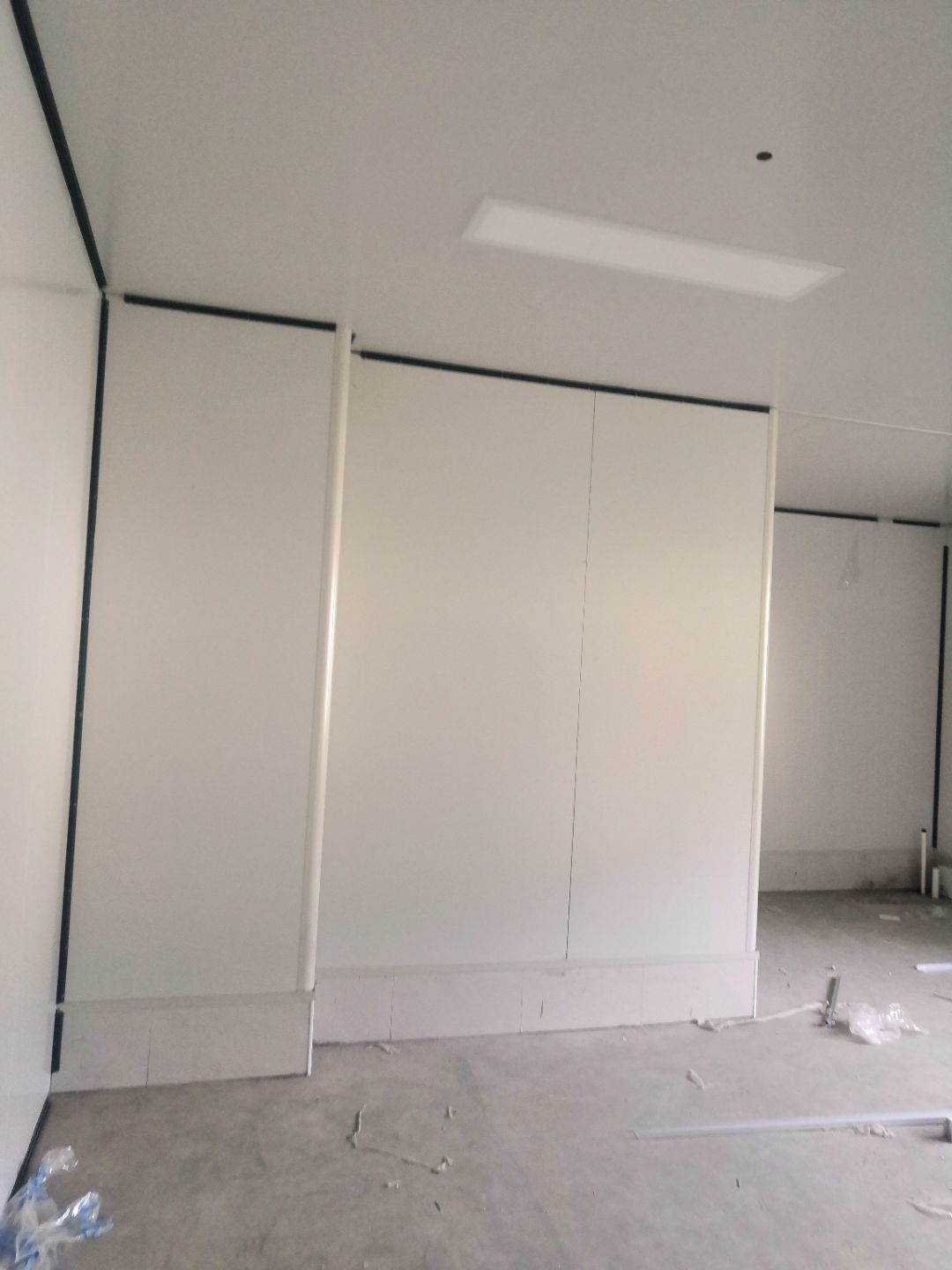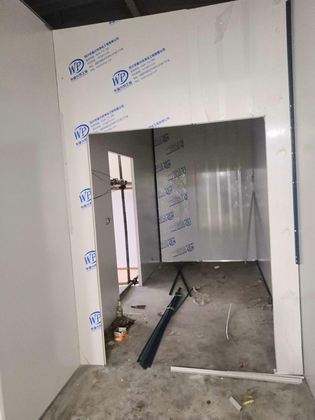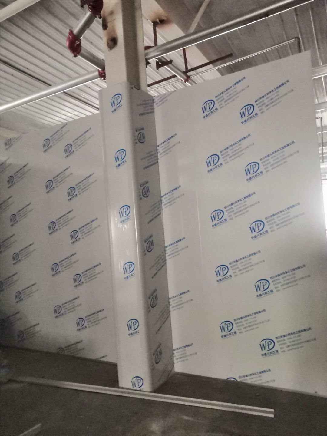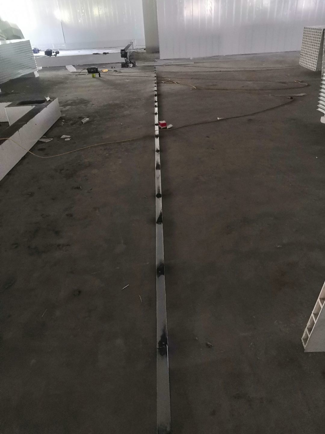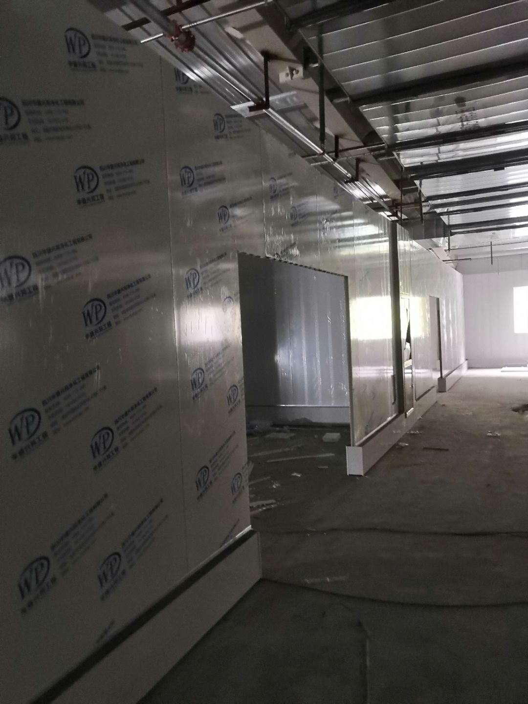 1.一樓樓梯間立墻板完成100%; 2一樓通道排燈線,二樓參觀通到排線;3. 電梯立墻板,一樓接臭氧管子90%。