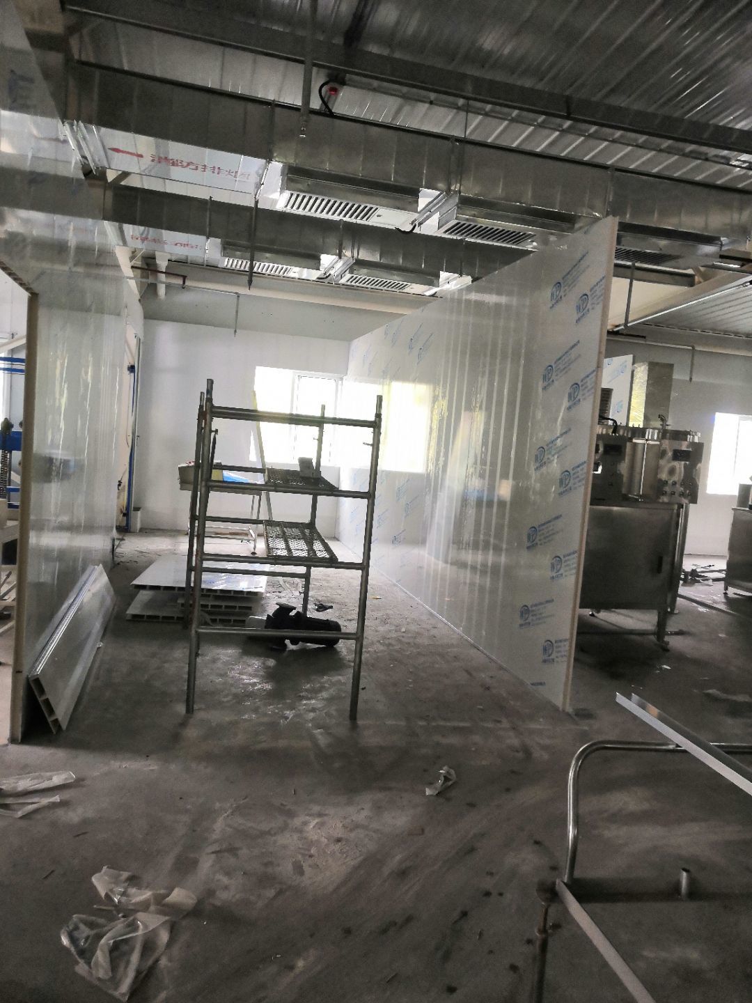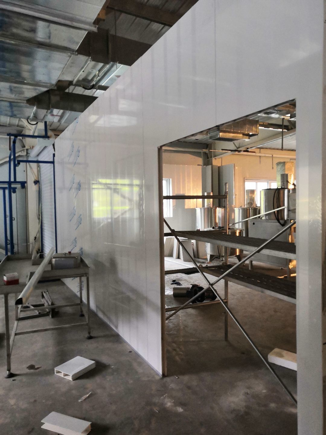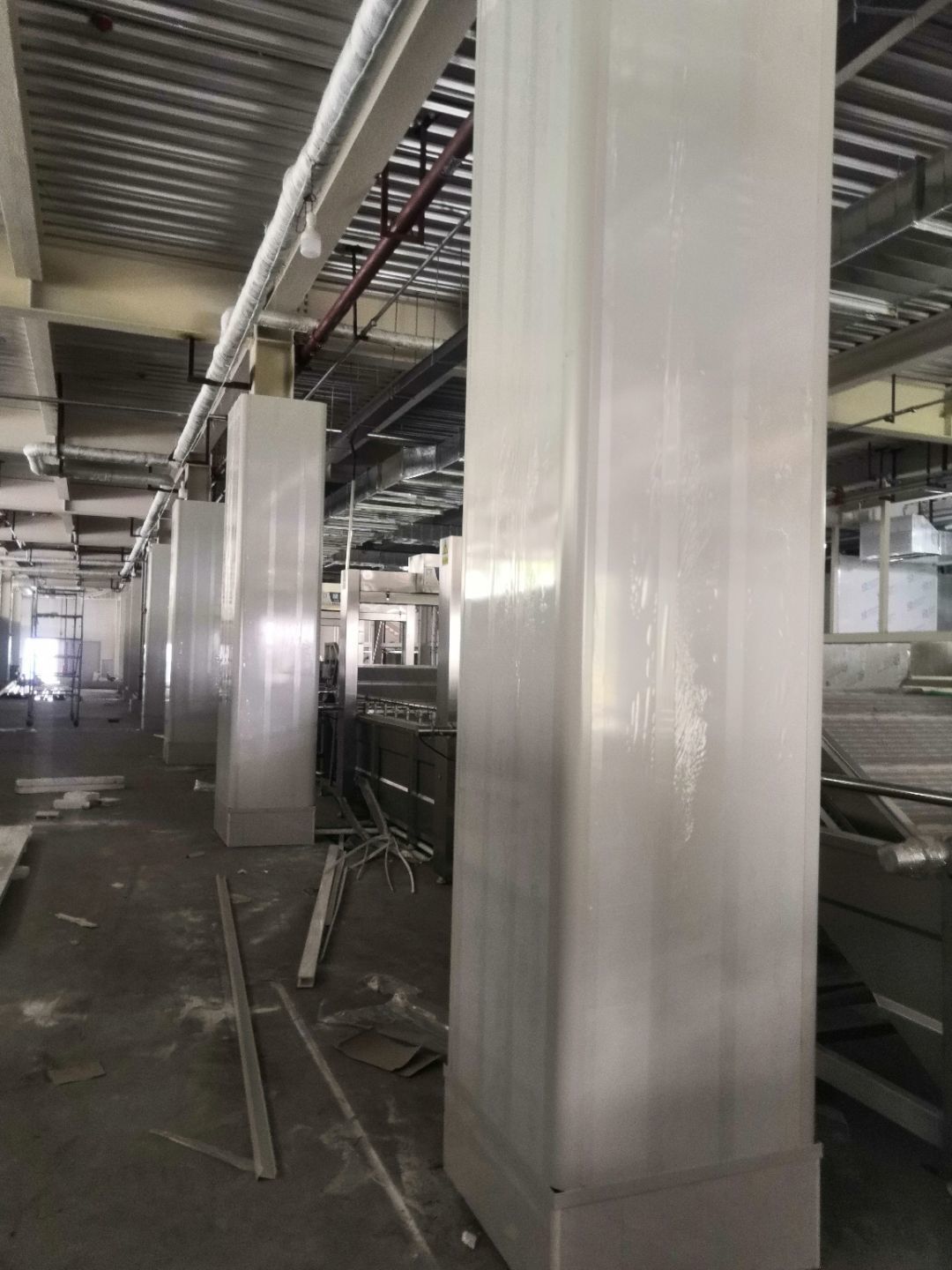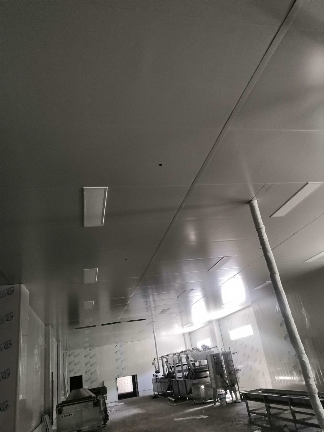 1、內包間,殺菌間,更衣間,煉油間打膠條,(完成二樓打膠條20%); 2、內包間拍圓?。ㄍ瓿啥菆A弧5%) ;3、殺菌間包氣管子。