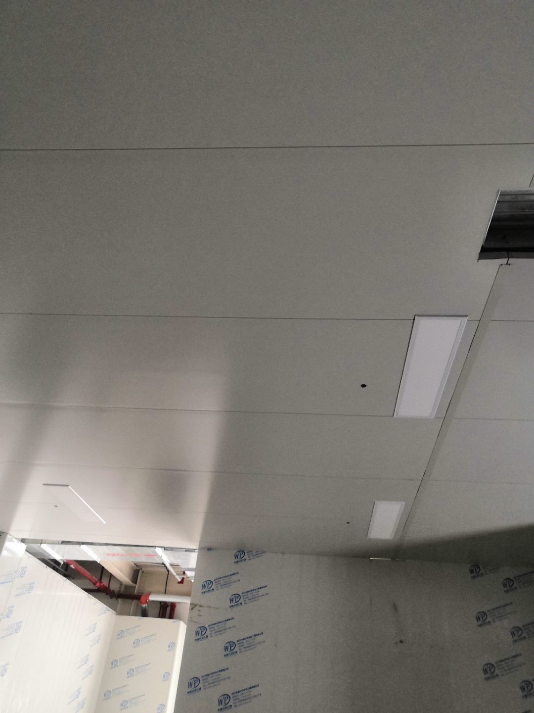 1.二樓內包間,更衣室,消洗間燈亮;2.二樓平板燈安裝完成70%;3.一樓立墻板包柱子完成85%;4.一樓安裝門框完成15%。