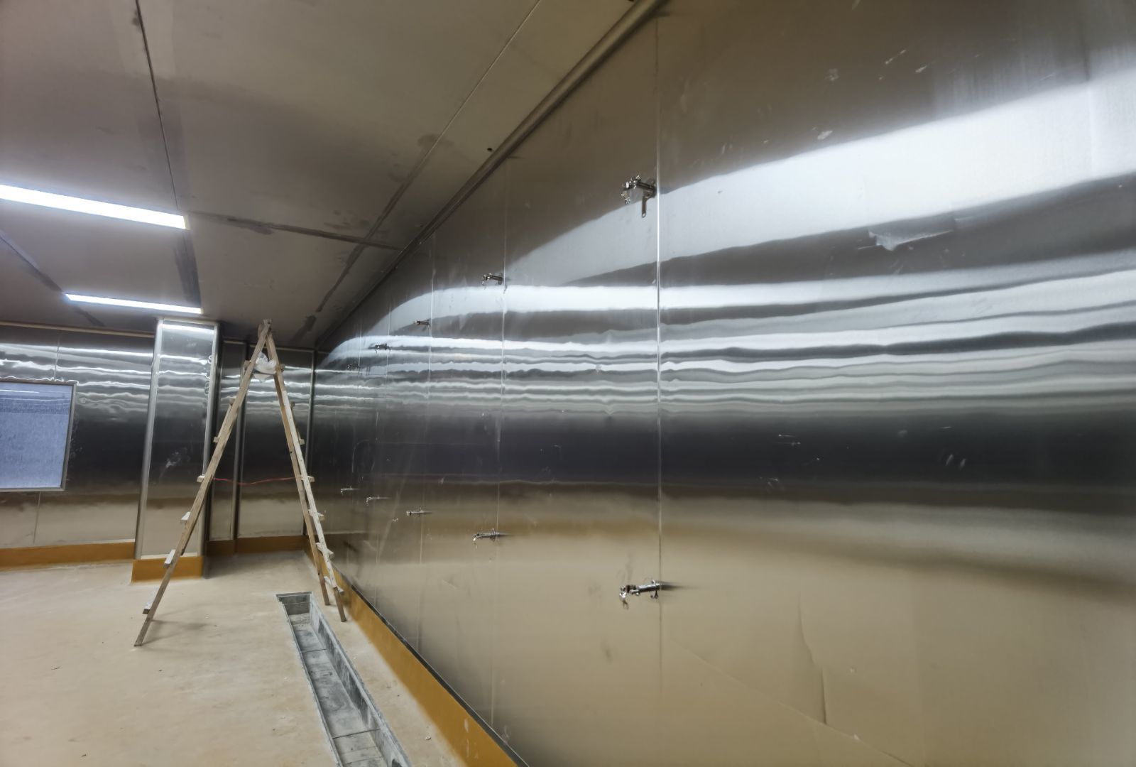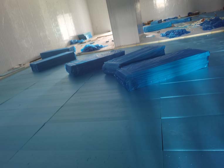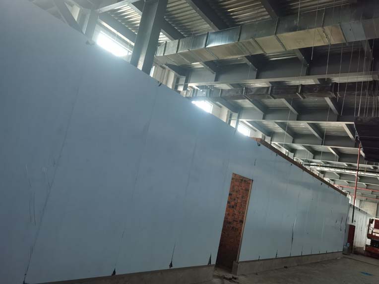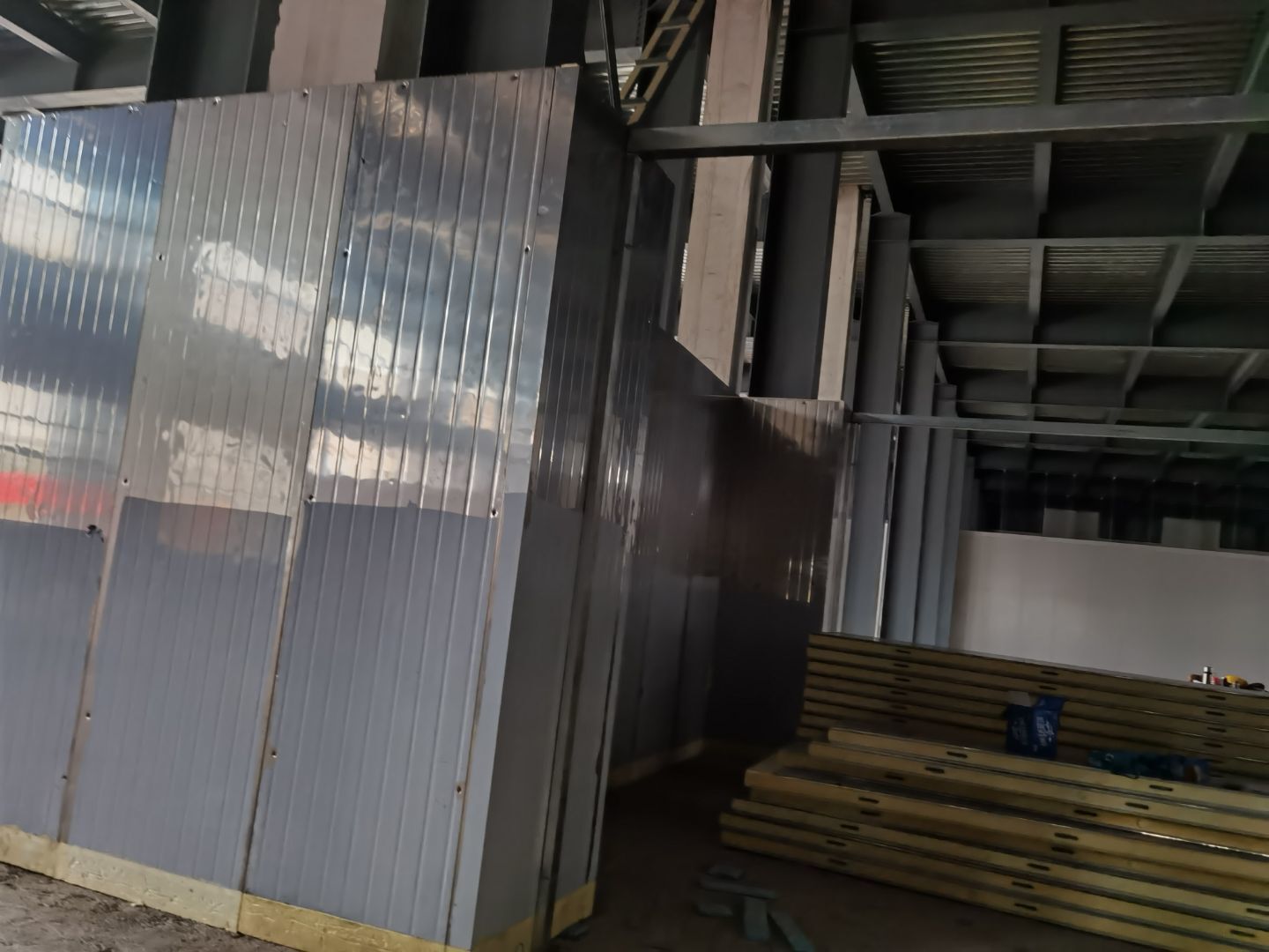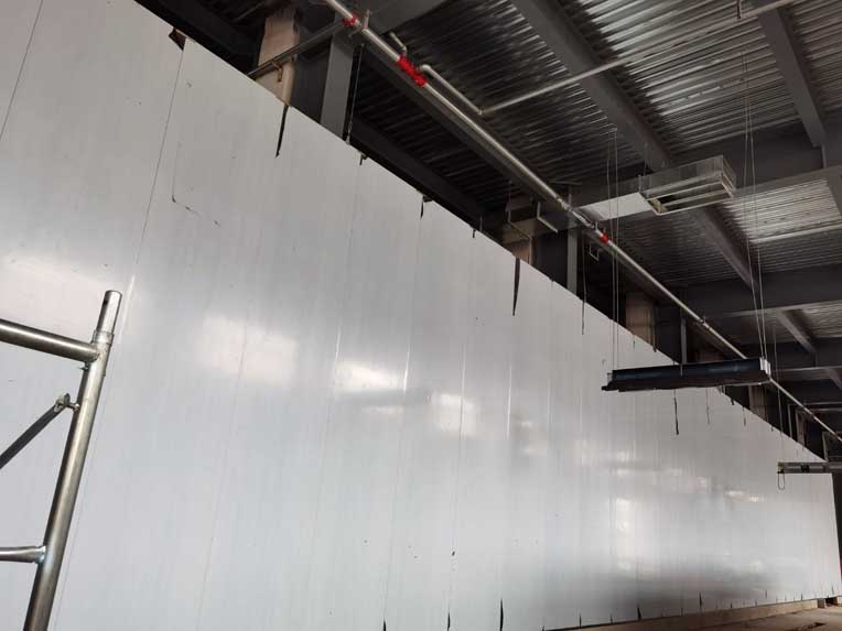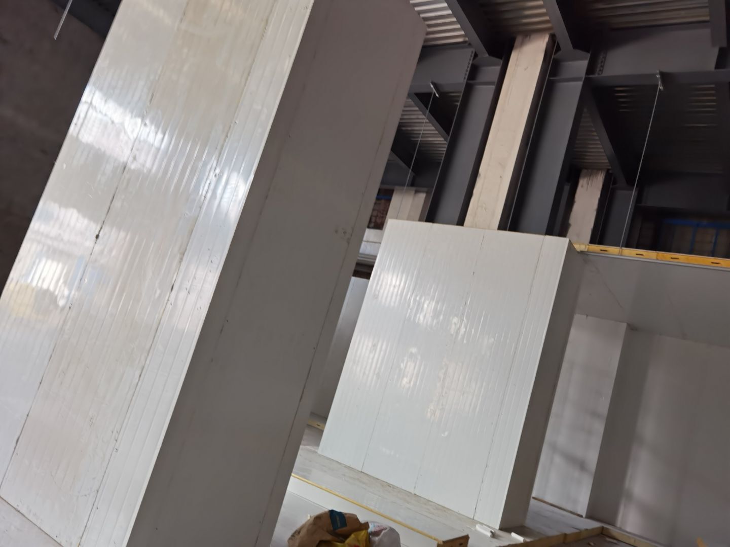 今日施工內(nèi)容 1,彩板拍圓弧 打膠 2, 二層鋁扣板安裝 3,二層風(fēng)管軟接 4,一層地坪施工 5,凍庫冷媒管安裝 6,二層墻板安裝 7,一層消防煙感安裝 8,蒸汽管道施工 9,門體安裝 今日材料進場 彩板 消防主水管 工藝設(shè)備