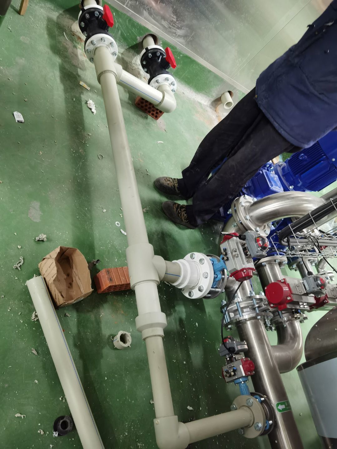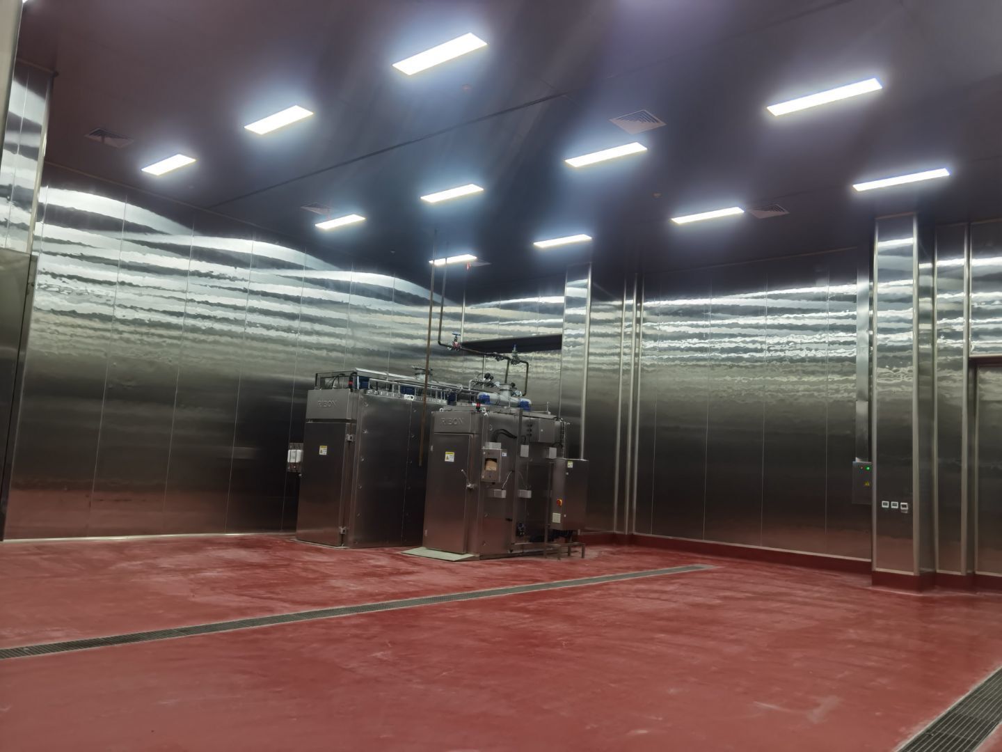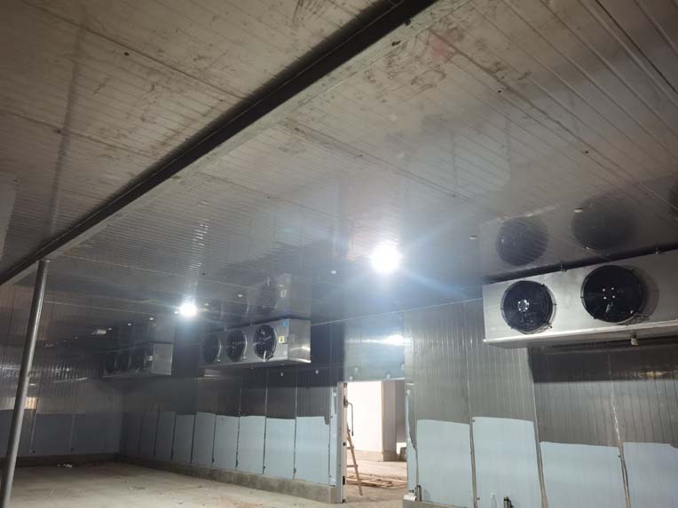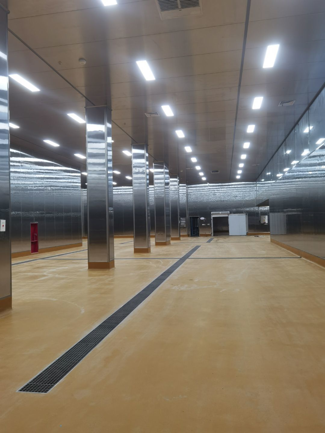 今日施工內(nèi)容 1,彩板拍圓弧 打膠 2, 二層鋁扣板安裝 3,二層風(fēng)管軟接 4,一層地坪施工 5,凍庫冷媒管安裝 6,二層墻板安裝 7,一層消防煙感安裝 8,蒸汽管道施工 9,門體安裝 今日材料進場 彩板 消防主水管 工藝設(shè)備