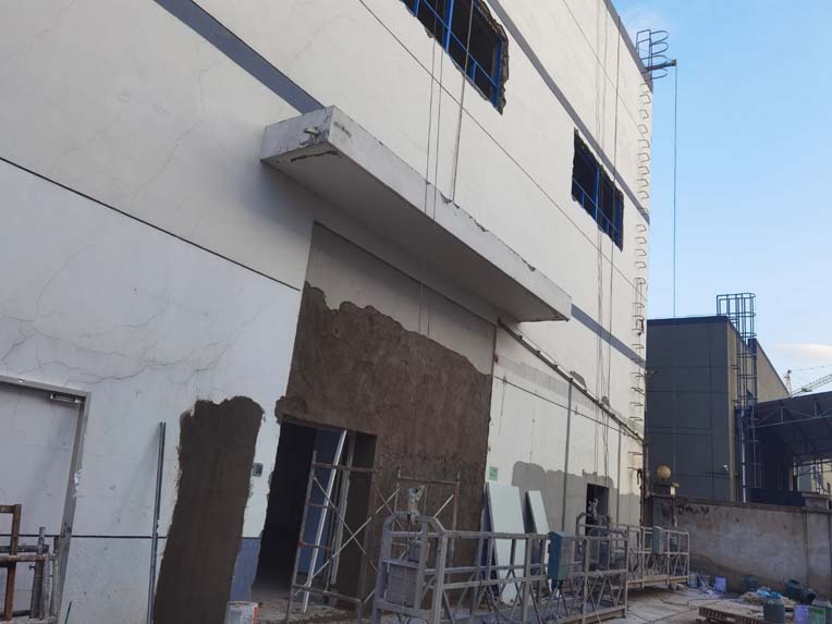 今日施工內(nèi)容 1,彩板立板安裝 打膠條 2,二樓動力電橋架安裝 3,一樓電梯安裝 4,一層燈具布線管 5,一層消防水管安裝 6,西面室外外墻噴真石漆 7,南面鋼結(jié)構(gòu)施工 8,地坪開始施工
