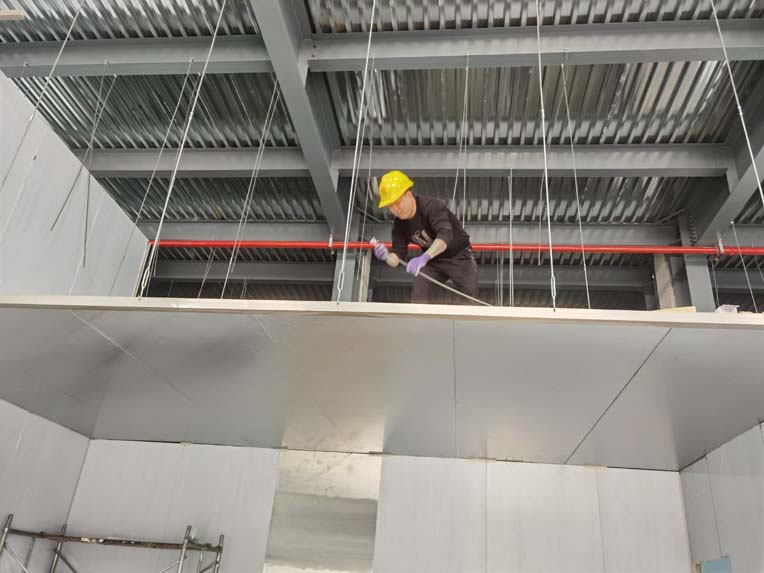 今日施工內(nèi)容: 1,彩板頂板安裝 掛T鋁 2,室外門衛(wèi)安抹灰 3,二樓動力電橋架支架開始施工 4,室外消防水箱安裝 5,土建擋水墻斜抹灰 修補 6,二樓消防噴淋施工 7,室外外墻噴真石漆