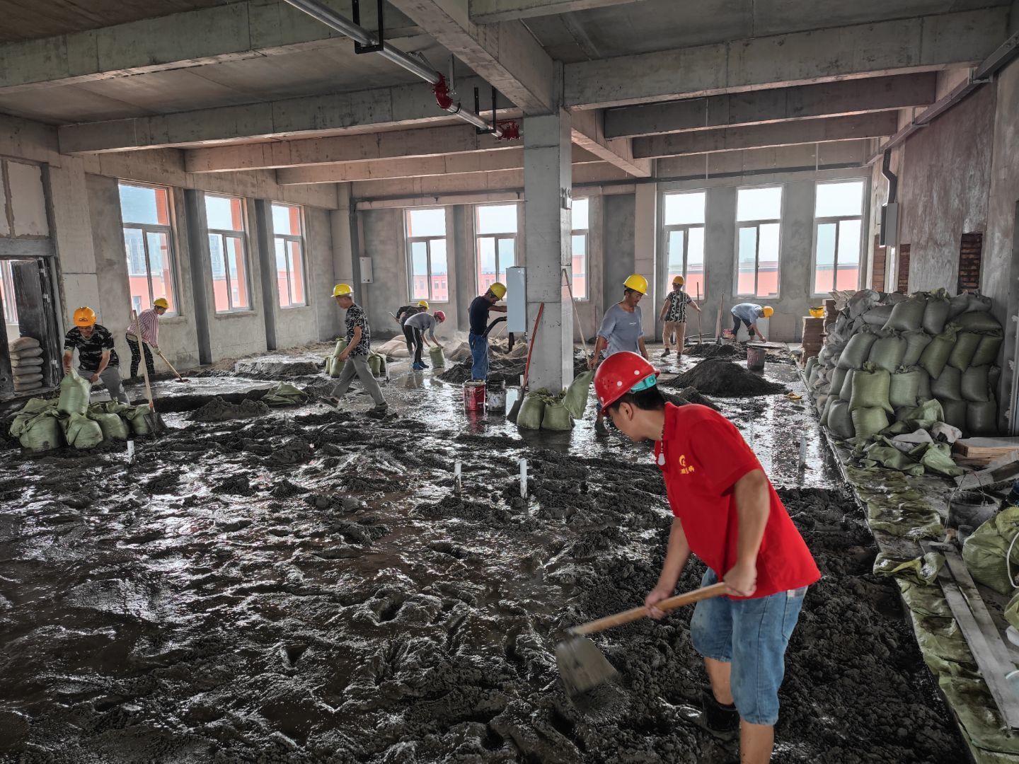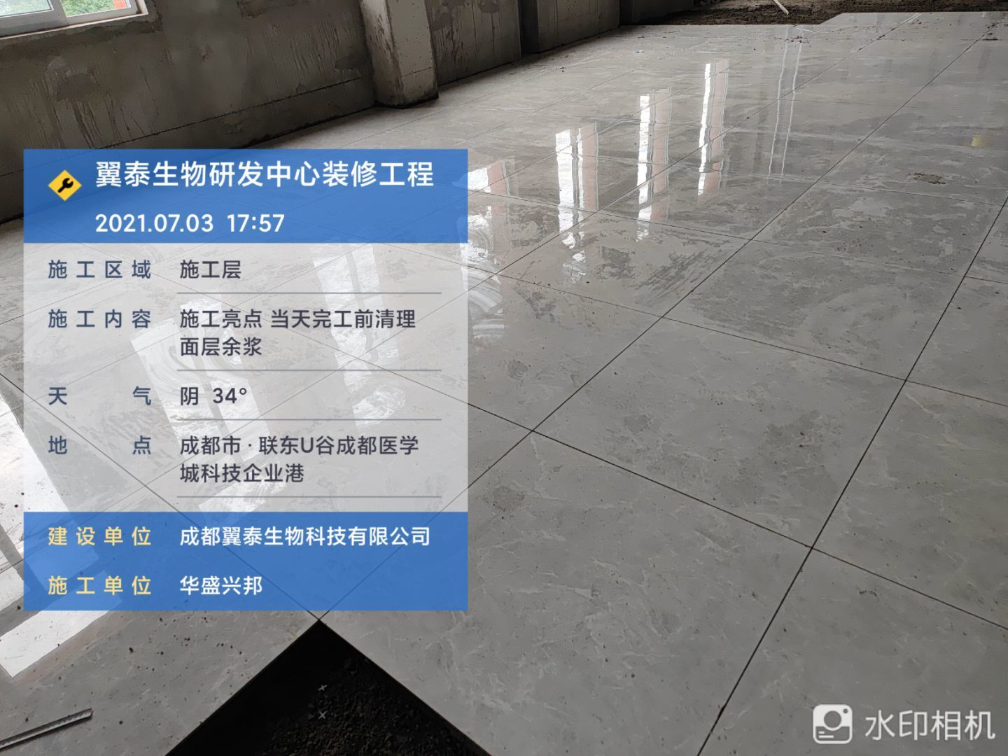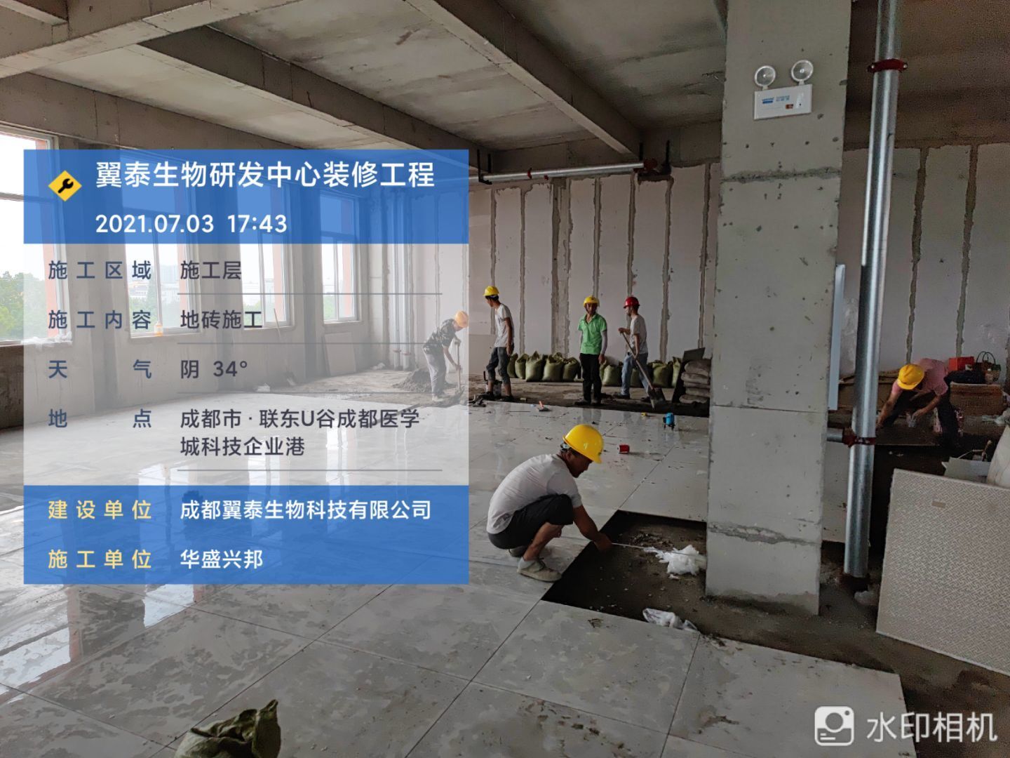 1.地磚施工人員,完成面積約30平; 2.砌體抹灰施工,衛(wèi)生間包排水管 抹灰完成1/3