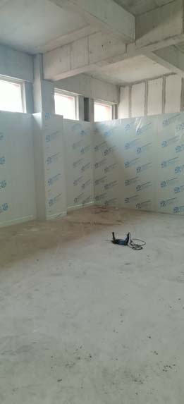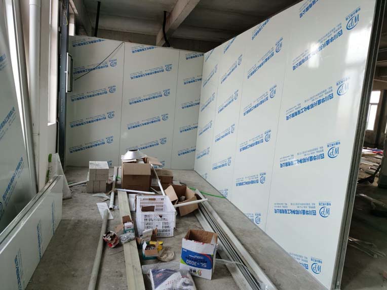 ①彩鋼墻板立板完成40% ②衛(wèi)生間土建施工完成80% ③ 凍庫制作安裝完成80%