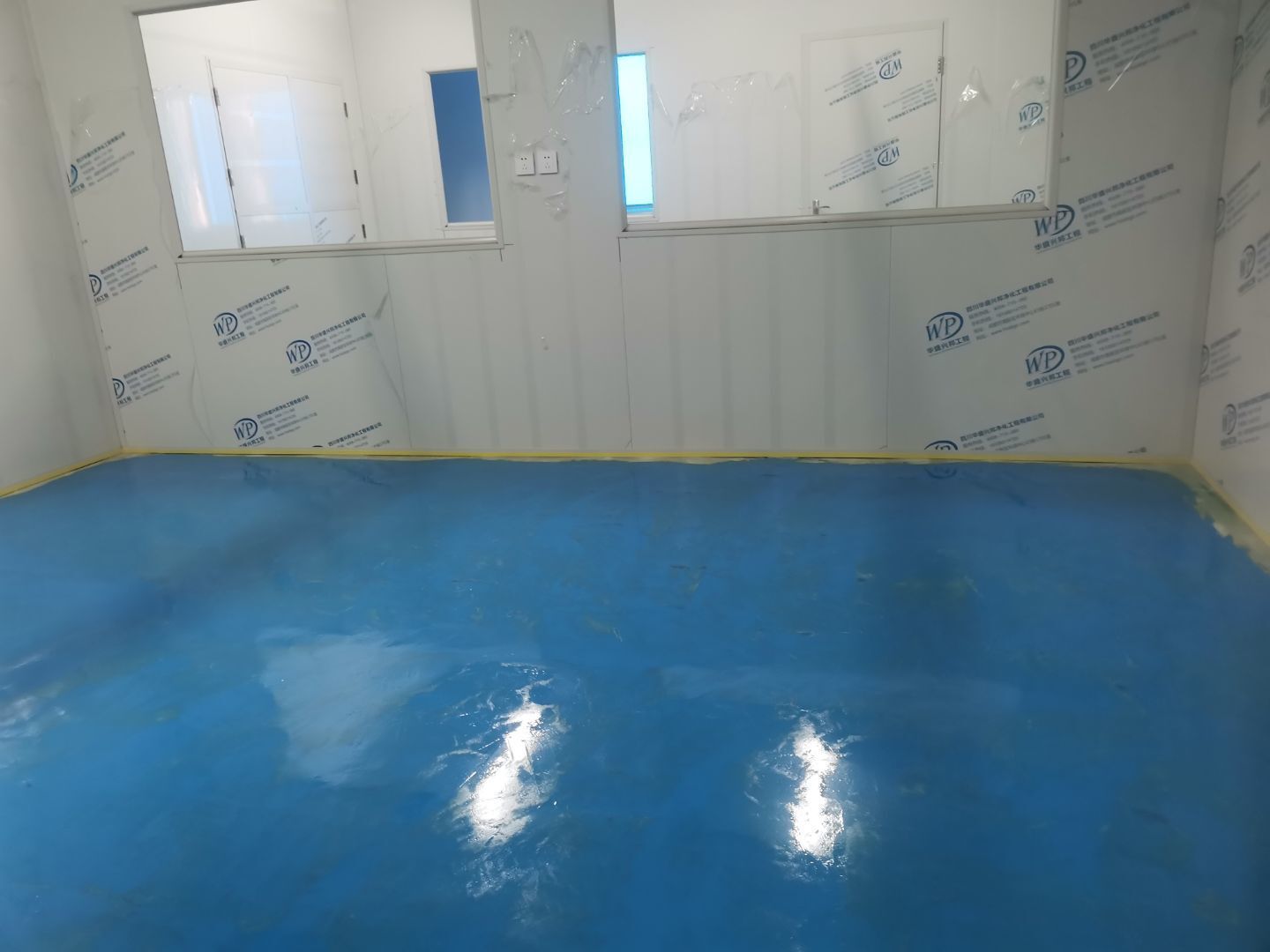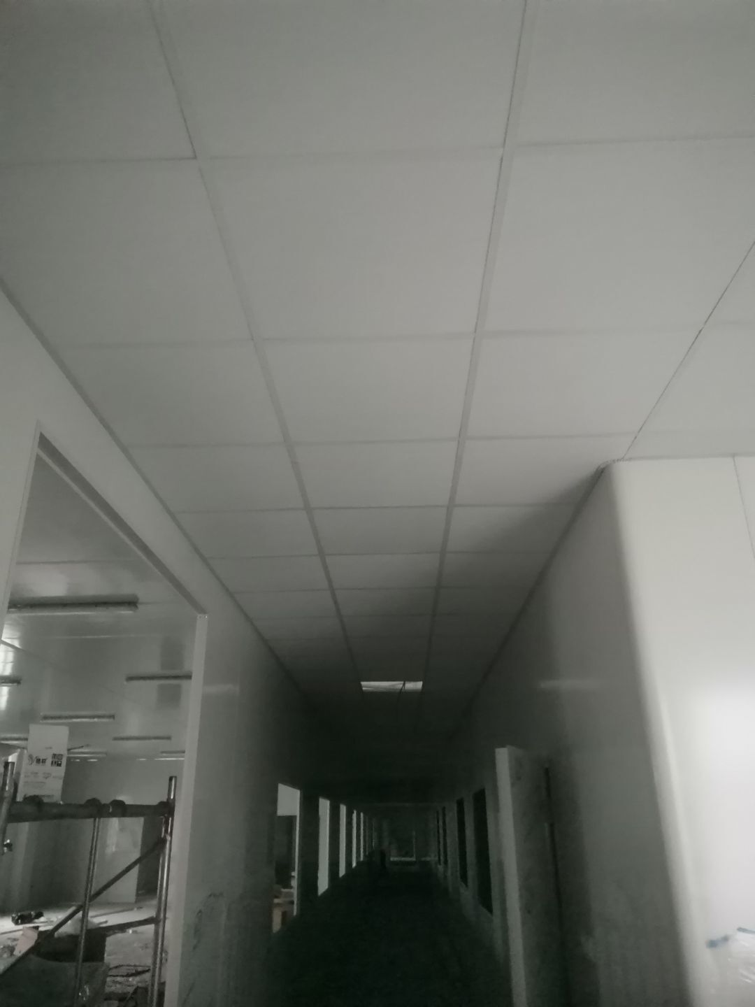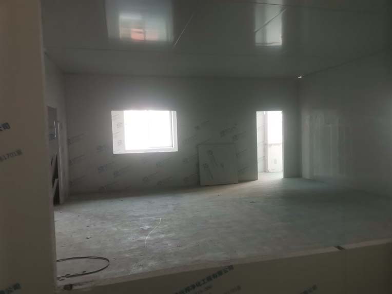 1.頂板安裝完成100%; 2.三防板吊頂完成100%; 3.水電安裝完成90%,燈具安裝完成95%; 4.新增動力電完成90%; 5.衛生間隔墻完成100%; 6.腳踏池完成100%; 7.風淋室制作完成90%; 8.地坪膩子層完成80%; 9.場地清理。