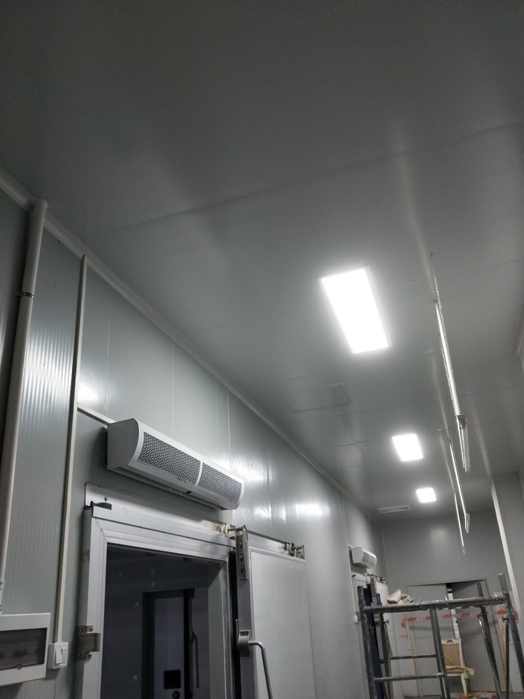 1:彩鋼墻板完成100% 2:彩鋼頂板完成100% 3:撕膜打膠完成100% 4:自制門窗完成100% 5:水電完成98% 6:圓弧完成95% 7:金剛砂完成100% 8:三防板吊頂完成100% 9:地面固化完成100% 10:動力電完成100% 11:空調安裝完成100% 12:聚氨酯地面完成100%