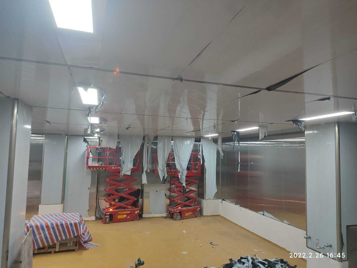 1,彩鋼板吊頂完成90% 2,圓弧完成40% 3,空調設備末端水管配管完成95% 4,照明插座配管穿線完成75%