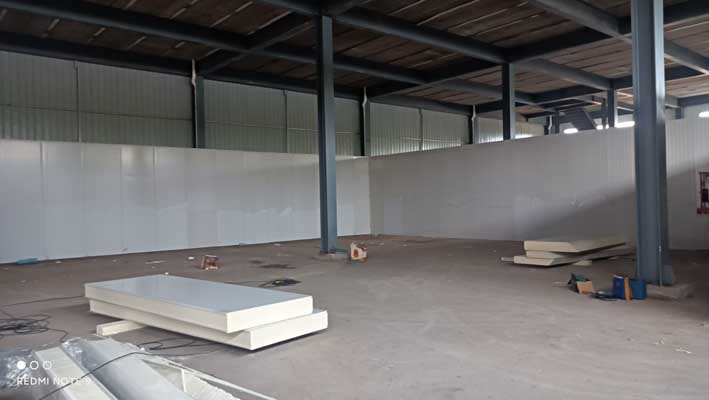1,鋼材除銹刷漆。 2.原料庫板安裝,速凍庫板安裝,緩存間庫板安裝, 3.成品庫庫板安裝, 4.衛生打掃, 三.材料進場, 凍庫板到貨及輔材到貨,凍庫板安裝