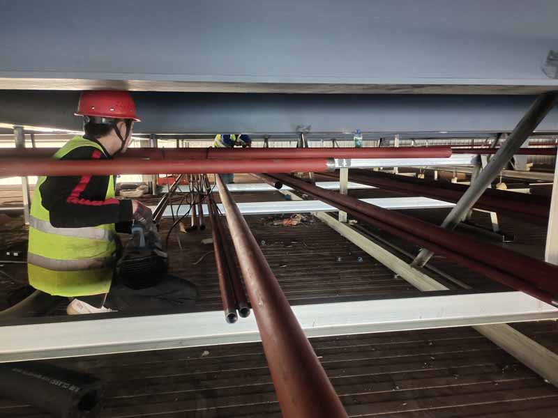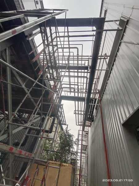 1、原料庫布線及庫燈安裝完成。 2、庫頂管道支架完成, 3、庫頂無縫鋼管作業 4、成品庫庫頂安裝完成 5、開關布線